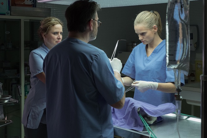 Nous ne pouvons pas nier tout le travail d’investigation fouillé préalable au tournage du film par Julie Manoukian, pour lui donner de la crédibilité. La réalisatrice s’est entourée également des conseils avisés de Laetitia Barnerin, docteur vétérinaire, dès les prémices de l’écriture du scénario. Notons que les femmes sont désormais majoritaires dans cette profession demandant beaucoup de sacrifices. Les vétos reflète le quotidien d’une clinique de campagne, campée avec réalisme, dans une zone à la ruralité profondément marquée. D’où le décalage profond au départ entre Alexandra -jouée par Noémie Schmidt-, Parisienne fraîchement diplômée, et ce nouvel Éden professionnel qu’elle va apprivoiser et qui va l’apprivoiser, pour finir par la convaincre de rester. Initialement, ce n’est pas un pari gagné, loin s’en faut.