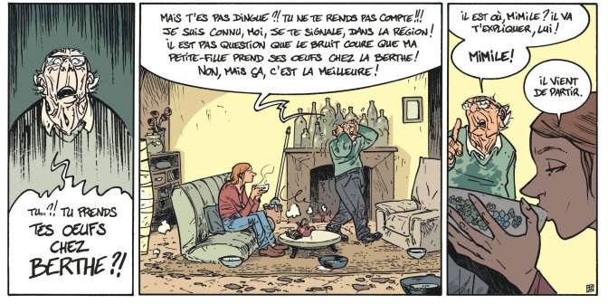Enfin, surtout Antoine et Pierrot. Le troisième larron, Mimile, "celui qui part", donc, était jusqu’à présent plus mystérieux et surtout plus discret. Pourtant les rares indices à son sujet que l’on pouvait grappiller au détour d’une case, çà et là, étaient plus qu’alléchants : un aventurier ayant sillonné le Pacifique avant d’y faire fortune puis de tout perdre, ça éveille la curiosité. Cet album est l’occasion de mieux le connaître, et cela alors qu’il y passe le plus clair de son temps dans un lit d’hôpital. Et on se rend vite compte que c’est lui le chaînon manquant entre l’australien, la Berthe et tout le reste. On apprend ainsi, sur fond d’occupation allemande, les raisons de la mise à l’écart de Berthe, et les évènements ayant conduit au départ de Mimile. Quand au vieil australien, on ne veut pas vous gâcher la surprise donc il ne vous reste qu’à acheter l’album.