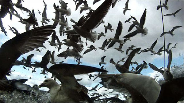 L’argument : En embarquant sur un chalutier pour dresser le portrait d’une des plus vieilles entreprises humaines, Véréna Paravel et Lucien Castaing-Taylor témoignent, dans un flot d’images sidérant, de l’affrontement qui engage l’homme, la nature et la machine. Tourné à l’aide d’une dizaine de caméras numériques ballottées au gré du vent et des vagues, sanglées aux corps des pêcheurs, aux cordages du bateau, gommant tous repères, et où la mer et le ciel finissent par se confondre, ce documentaire nous avertit des menaces de la pêche intensive autant qu’il révèle la beauté foudroyante des entrailles de l’océan.