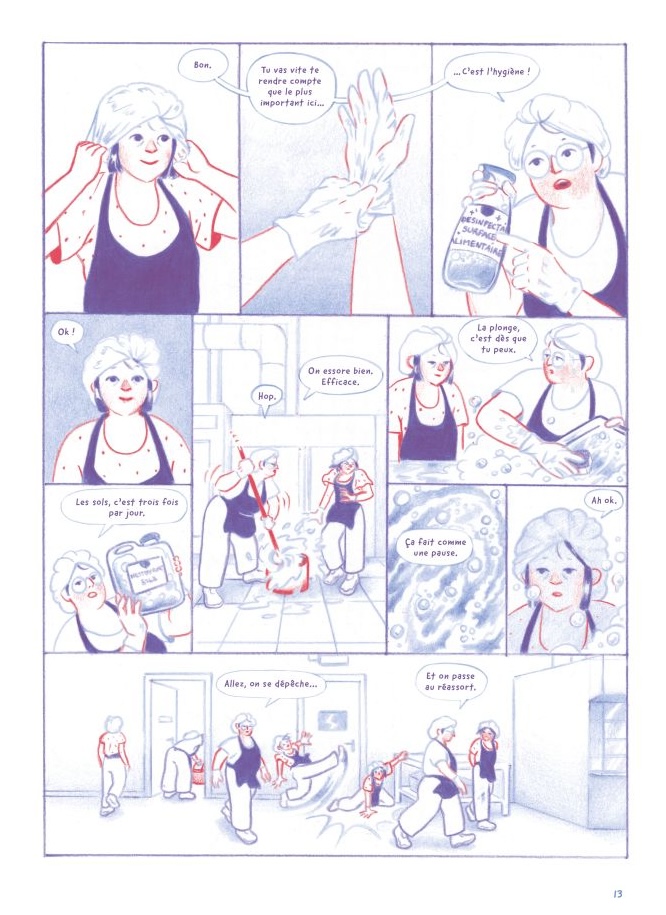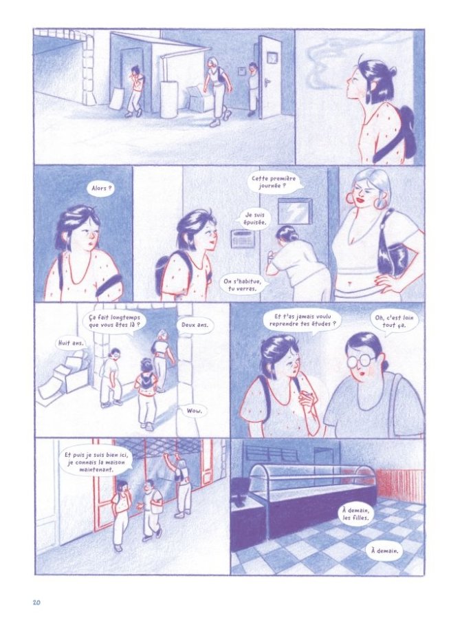 Critique : Pour sa première bande dessinée, Juliette Hayer opte pour des partis pris créatifs judicieux et marquants : dessin au crayon, utilisation de seulement deux couleurs (le bleu et le rouge), jeu sur le genre avec un entremêlement de la chronique sociale et du récit horrifique… Ces choix forts sont l’une des grandes qualités de cet album : dès le début, ils conduisent le lecteur à être emporté par une histoire qui s’engage toujours davantage sur des territoires inattendus et fantastiques.