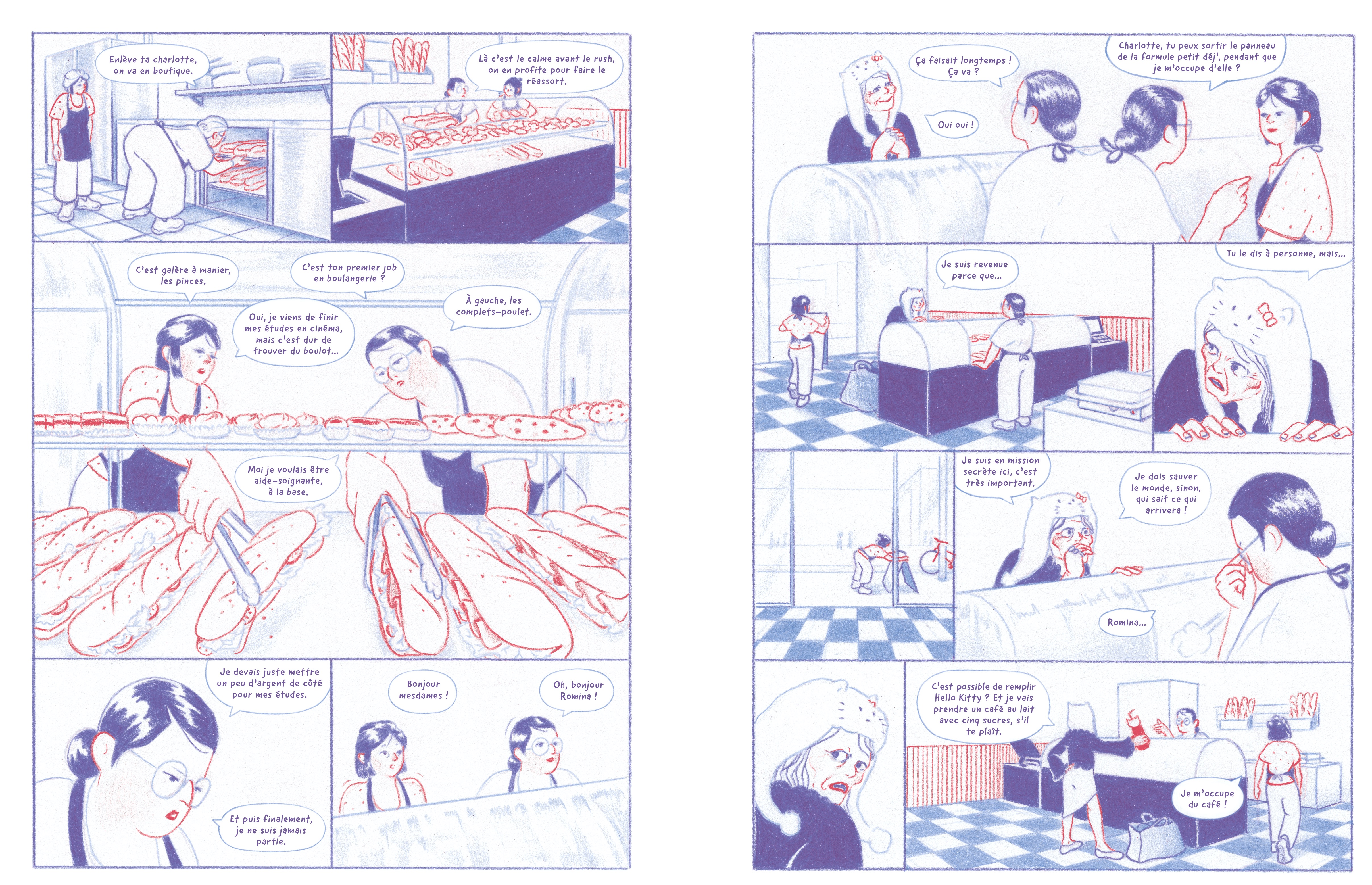 Critique : Pour son premier album, Juliette Hayer investit avec originalité le thème de la précarité de la jeunesse – Charlotte doit travailler pour vivre, et ce boulot l’aspire progressivement alors qu’elle a d’autres aspirations professionnelles – et de la souffrance au travail. Pour ce faire, elle investit le genre du fantastique avec une pointe d’horreur, pour filer une métaphore graphique efficace. Celle-ci est incarnée par la pâte à pain, qui prend vie sous les yeux de Charlotte (mais pas de ses collègues ?) lorsqu’elle travaille à la boulangerie. Cette pâte qui salit les lieux et attaque les corps représente la souffrance au travail de la jeune femme, que ses collègues ne semblent plus percevoir, tant ils l’ont intériorisée.