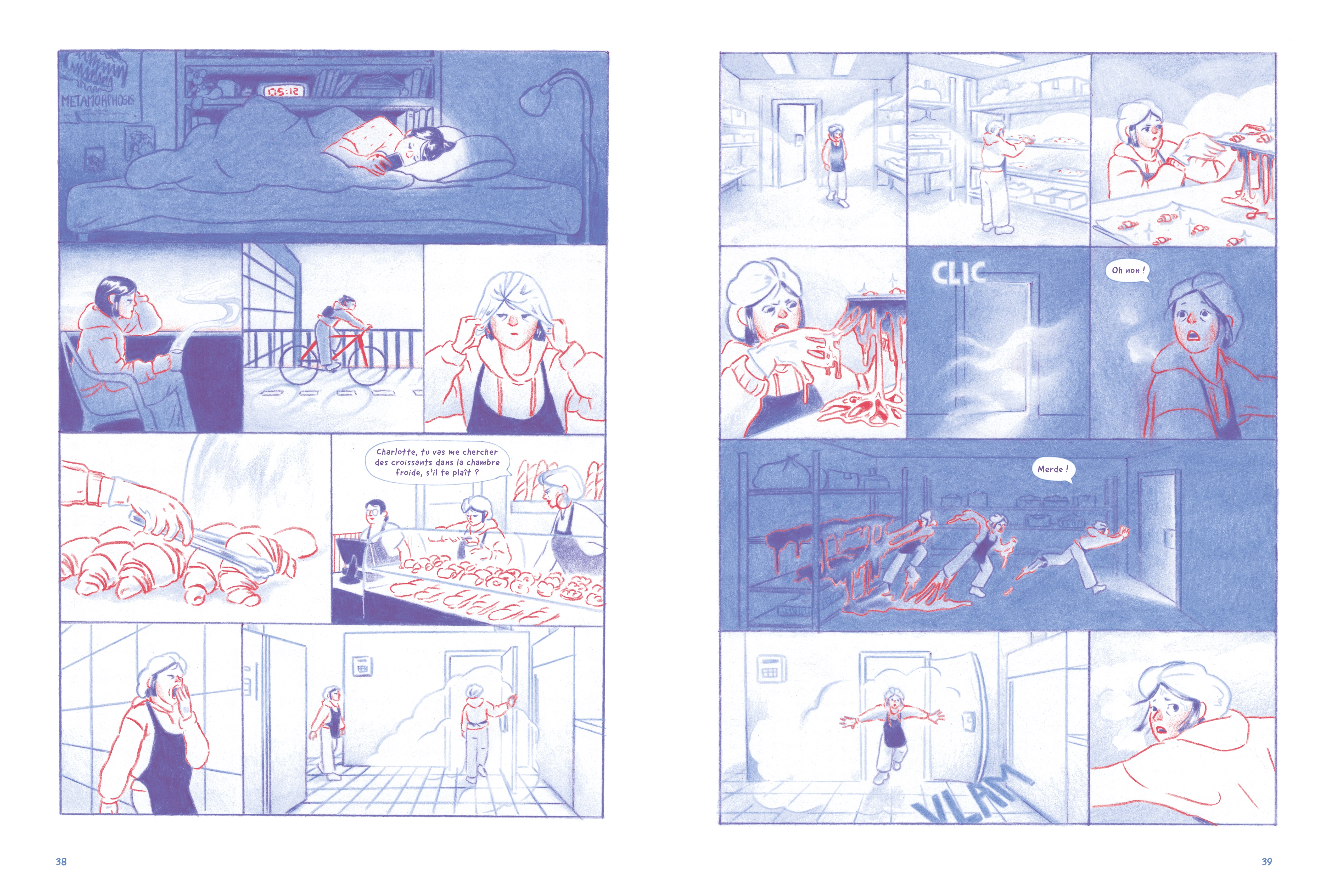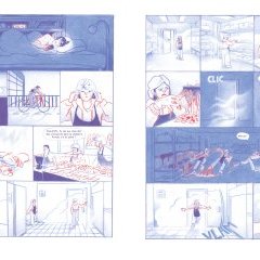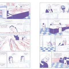 Cette idée, intéressante, est bien traitée tout au long d’un album dominé par une élégante bichromie bleue et rouge. Le dessin, réalisé au crayon, possède une véritable « pâte », si l’on ose dire. Les choix de mise en scène s’avèrent également astucieux, avec l’absence totale d’intervalle entre les cases – juste un trait épais – qui renforce la dynamique du récit et la sensation d’oppression dont l’héroïne est victime.