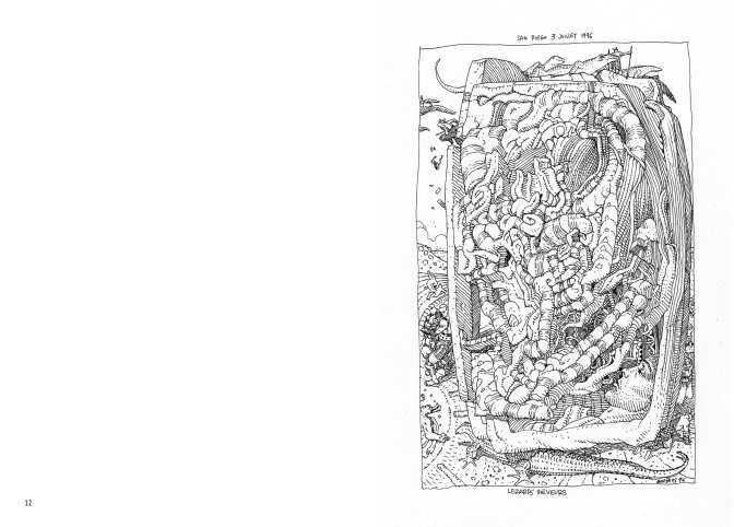 Il est étonnant de découvrir comment ce dessinateur de talent utilise l’objet carnet de voyage. Il s’agit d’y dessiner des idées, de jeter un début de BD, parfois aux cases encrées, dans un style épuré ou de tracer un dessin d’une complexité incroyable, et les œuvres s’enchaînent ainsi au fil des pages. Si le plaisir de découvrir comment Moebius se sert de ses carnets ne suffisait pas pour s’y plonger, la qualité du trait finit de vous convaincre.