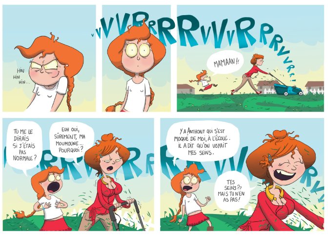 Tout cela grâce à un dessin expressif, lisible, extrêmement agréable, à des dialogues qui touchent juste, et à des péripéties incessantes. Mais, vous l’aurez compris, nous ne sommes pas uniquement face à une bande dessinée : le récit, aussi plaisant soit-il, sert de prétexte à l’introduction de nombreuses pages "pédagogiques" sur les seins, leurs différentes formes, le choix d’un soutien-gorge...... bref, autant de choses "utiles", pas forcément évidents pour une jeune fille entrant dans l’adolescence, ou pour un père célibataire ou divorcé.