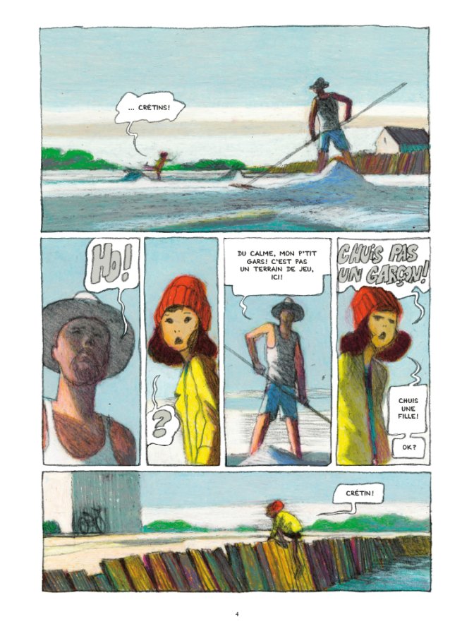 Pour le dessin, la technique du pastel à l’huile apporte toutefois une vraie force, une originalité épatante à ce premier tome. Ville, mer et campagne ont un côté éthéré, comme si les embruns de l’océan les avait recouvert, mettant en valeur le ciré ou le bonnet des personnages, qui eux aussi n’ont pas de traits véritablement définis, permettant à n’importe quel lecteur de s’identifier assez facilement. Ce sentiment de brouillard pourtant très coloré, très vivant, est un poil perturbant au début mais très vite devient la principale qualité de ce récit douillet.