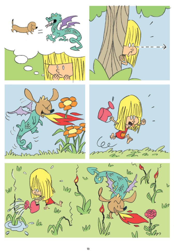 Alors, elle pense à une petite vengeance : elle cède un bout du met au chien qui se transforme aussitôt en dragon, puis part à l’assaut du jardin familial en incendiant tout ce qu’il croise et en enchaînant catastrophe sur catastrophe.