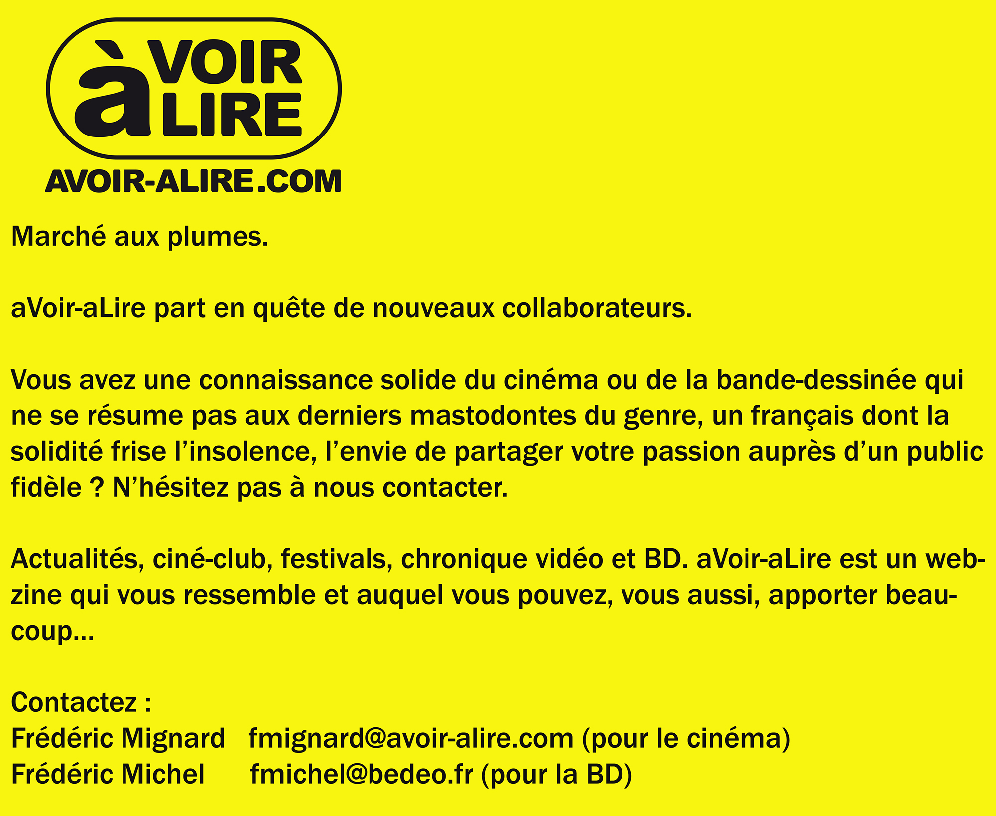 aVoir-aLire.com, dont le contenu est produit bénévolement par une association culturelle à but non lucratif, respecte les droits d’auteur et s’est toujours engagé à être rigoureux sur ce point, dans le respect du travail des artistes que nous cherchons à valoriser. Les photos sont utilisées à des fins illustratives et non dans un but d’exploitation commerciale. Après plusieurs décennies d’existence, des dizaines de milliers d’articles, et une évolution de notre équipe de rédacteurs, mais aussi des droits sur certains clichés repris sur notre plateforme, nous comptons sur la bienveillance et vigilance de chaque lecteur - anonyme, distributeur, attaché de presse, artiste, photographe. Ayez la gentillesse de contacter Frédéric Michel, rédacteur en chef, si certaines photographies ne sont pas ou ne sont plus utilisables, si les crédits doivent être modifiés ou ajoutés. Nous nous engageons à retirer toutes photos litigieuses. Merci pour votre compréhension.