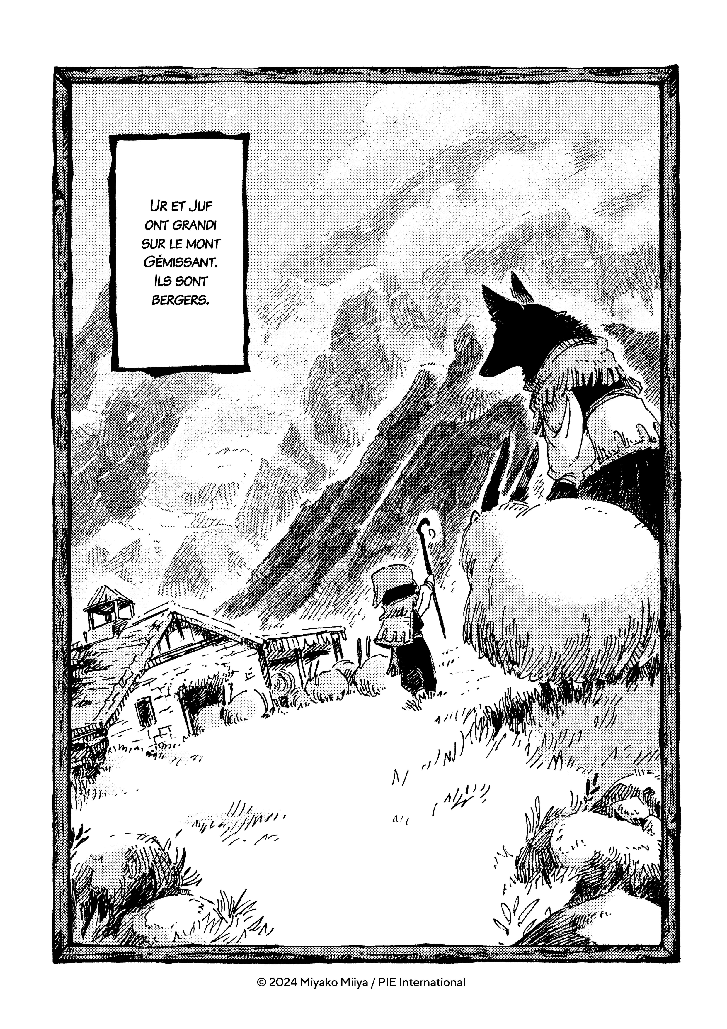 Mais revenons sur l’histoire, celle d’un frère, Ur, et d’une sœur, Juf, bergers de profession perdus dans le « Mont Gémissant ». Une chaîne de montagne absolument magnifique mais qui possède une très mauvaise réputation, comme nos deux héros, car ce que nous avons omis de signaler, c’est que Juf possède de grandes oreilles, une fourrure noire et de grandes dents : l’apparence d’une louve en somme. Cette apparence cache un trésor de gentillesse et la peur qu’elle inspire est un véritable fardeau pour elle d’autant qu’elle éprouve des difficultés à communiquer.