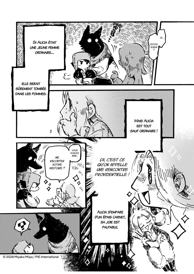 Critique : Après les Contes fabuleux de la nuit, Miyako Miiya revient avec une nouvelle histoire, plus longue, mais toujours aussi belle ! Elle conserve néanmoins un aspect feuilletonnant car la vie de nos héros est racontée du point de vue de plusieurs personnages, allant d’une princesse à un agneau en passant par un chasseur et même un petit escroc des bas quartiers de la capitale …