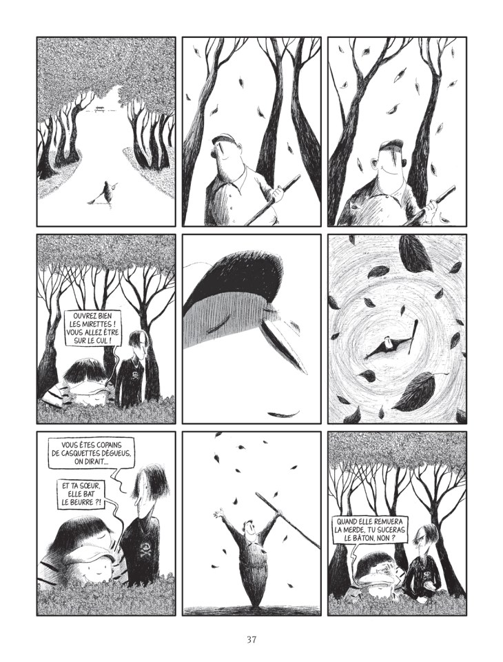 Critique : Il y a finalement peu de livres qui arrivent à surprendre, une fois la couverture et les premières pages passées, et même si les romans graphiques peuvent compter sur une diversité de traits et de styles au cœur d’un même ouvrage, il n’en existe pas beaucoup qui bousculent le lecteur par la multiplicité des tons. Lucien parvient à dissimuler une profondeur, ou plutôt à retourner certains acquis. L’album apparaît d’abord comme un conte cruel moderne, avec une relation d’amitié entre un petit garçon et un grand enfant qui se trouve mise à l’épreuve, la méchanceté des adultes finissant par l’emporter. On assiste ensuite à l’arrivée d’un quatuor de nouveaux personnages plus sombres, à une relation toxique amoureuse et à un final à la Pulp Fiction. Cette violence insoupçonnée se greffe à cette fable sur l’amitié qui se joue sur une dizaine d’années, l’ellipse se trouvant être un bon moyen pour modifier la tonalité, plus tragique, plus malsaine aussi. Et c’est là la certitude, Lucien n’est finalement pas un être simple.