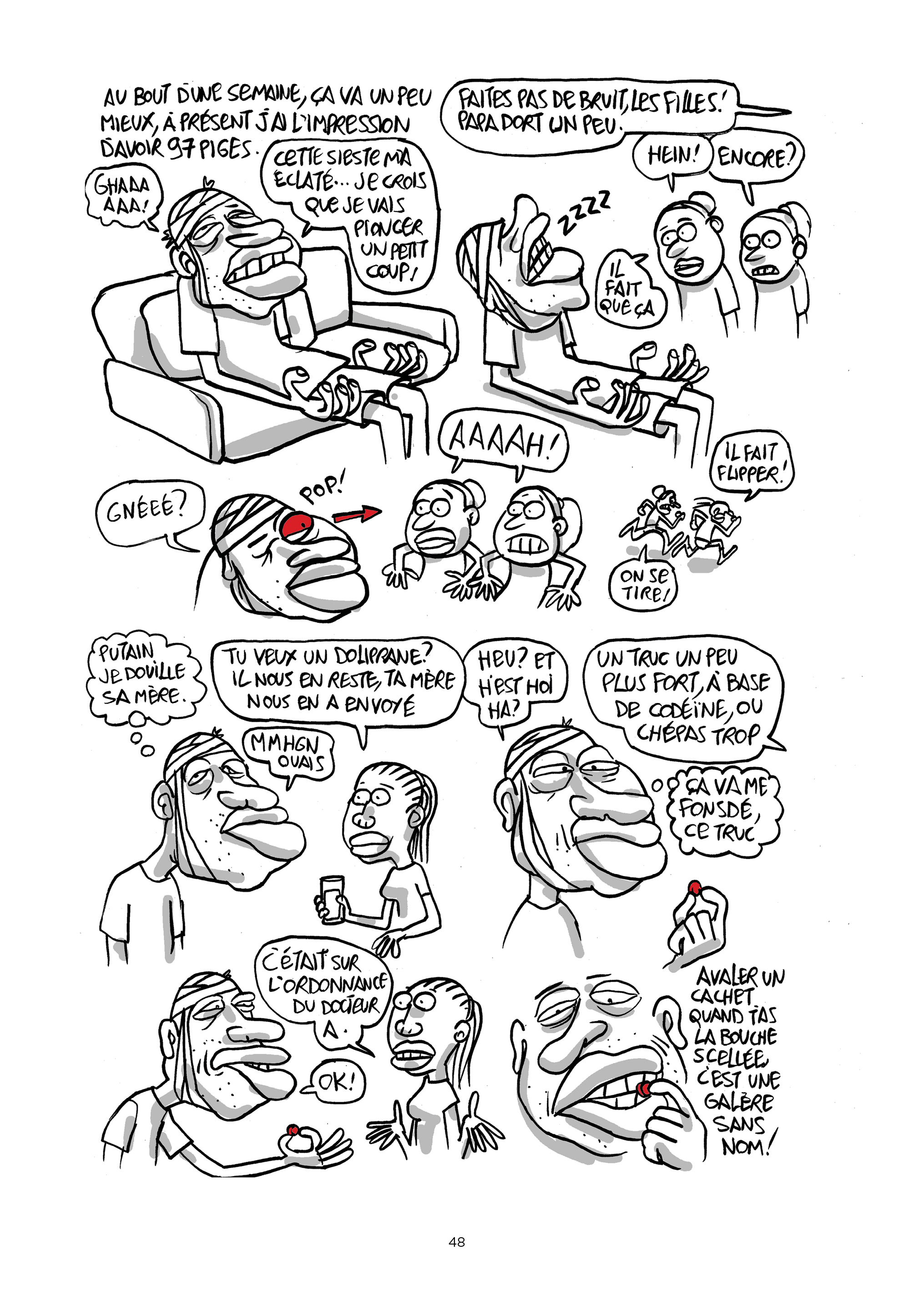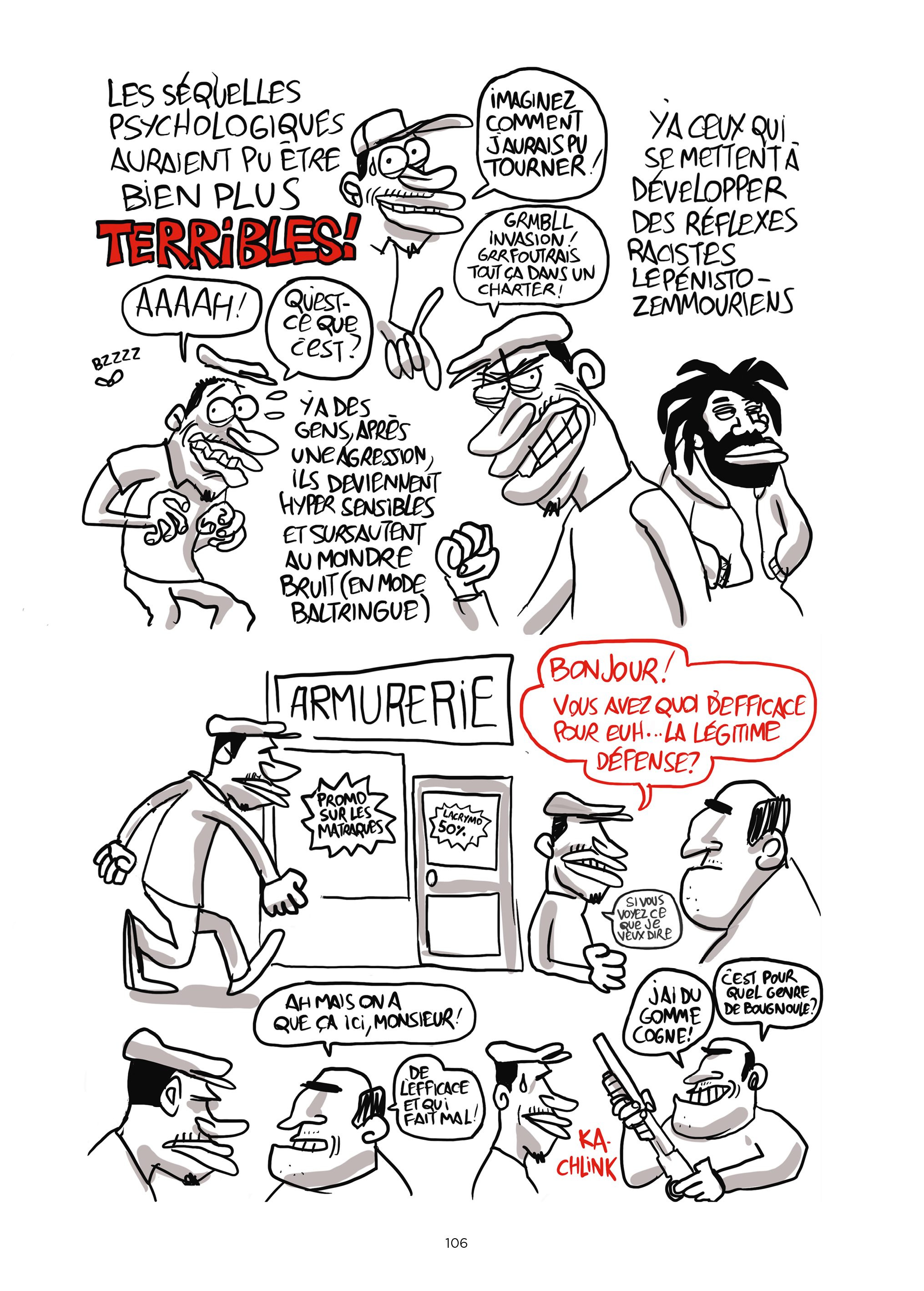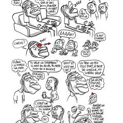 Son trait est volontairement grotesque. Ici, pas de cases, mais des dessins croqués au fil des pages formant des saynètes…Des « crobards » au sens noble du terme, c’est vif et piquant.