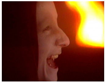 A d’autres moments c’est par les voix de chanteurs d’opéra que les corps sont habités. Mais le plus étonnant ici sont les passages au son direct lorsque Schroeter demande à ses acteurs de chanter des arrangements des airs de Verdi (pour quatuor de violon, accordéon, hautbois et piano) et que leur technique vocale insuffisante les fait s’égosiller péniblement. Ainsi Annette Tirier (Lady Macbeth), fixant la tache de sang qu’elle est seule à voir, n’hésite pas, poussée par son metteur en scène, à se lancer à corps perdu dans une reprise du redoutable une macchia è qui tuttora après l’avoir mimée une première fois sur la voix de Maria Callas. La comparaison est évidemment écrasante mais on ne peut qu’admirer le cran de l’actrice allant bravement au bout de l’épreuve avec une espèce d’inconscience butée qui dépasse très vite le stade du ridicule pour atteindre à une forme de sublime.