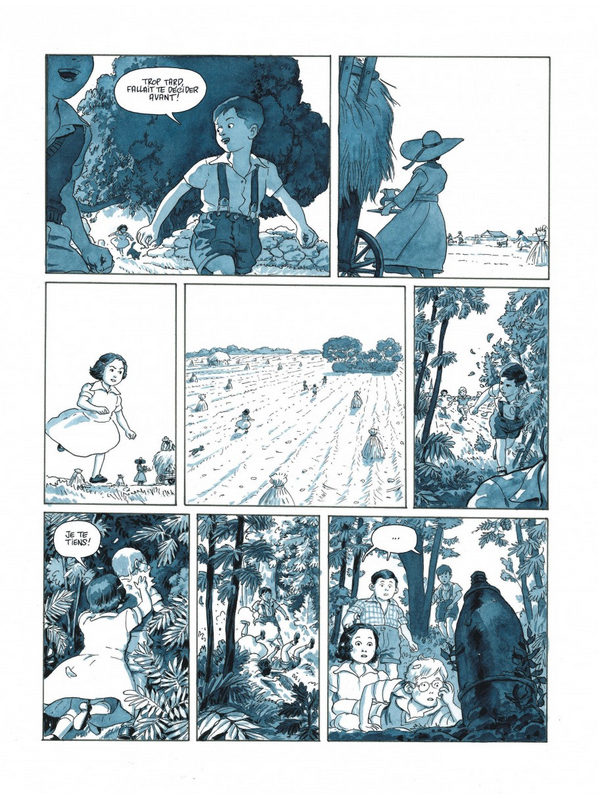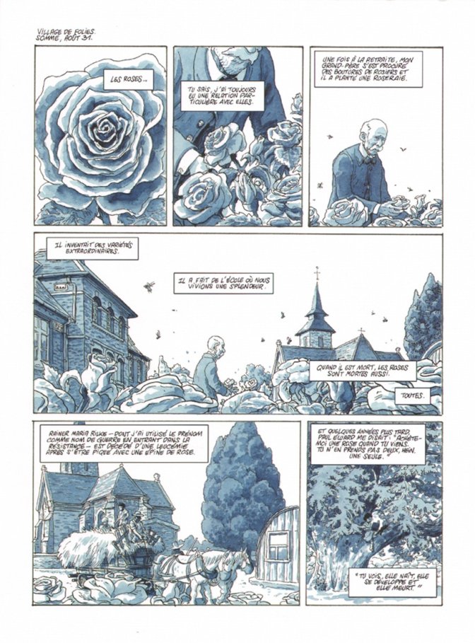 Cet héroïsme, mais aussi et beaucoup ce quotidien, car il ne faut pas oublier que la majorité de ce premier tome se passe dans un sanatorium perché dans la montagne, où Barthes qui va jaillir se glisse à côté d’anonymes qui vont mourir. Étrange comme le dessin semble se fondre dans la littérature, ce bleu et ce blanc rappelant ces pages à l’encre d’antan. Les surréalistes, Rilke ou même les poèmes de Riffaud elle-même rythment ces pages où le blanc, le vide n’est jamais anodin. Toujours triste, mélancolique, parfois violent, mais jamais dénué d’intérêt. Et le bleu vient jouer sur les regards, les joues, les lèvres comme s’il était rouge sang, adoucissant peut-être, sublimant assurément.