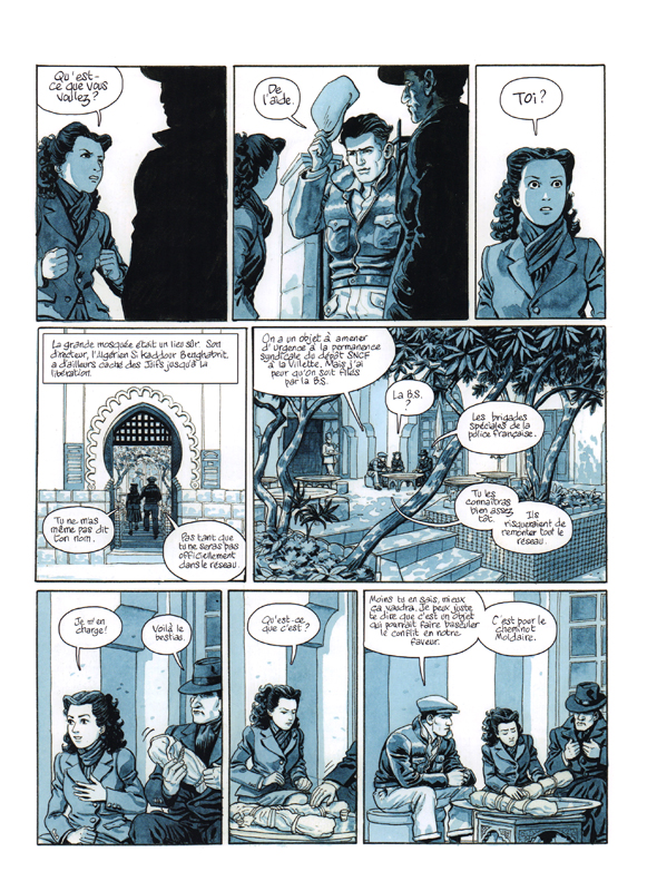 Le trait bleuté de Dominique Bertail revient hanter cette période, comme si la chape du IIIème Reich, généralement grise et noire ponctuée de rouge, avait été un peu atténuée, se voulant du côté des vaincus. Cette froideur des couleurs illustre parfaitement les sentiments et émotions mis de côté pour ne pas se faire surprendre, pour tout calculer, tout protéger en cas de chute, tout anticiper, même sa propre mort. Aussi les ennemis, les collabos, mais aussi les résistants et les civils innocents, sont-ils tous mis sur un pied d’égalité, humanité contre humanité, choix contre choix, comme ce vieux soldat épargné dans un pillage, mais qui reviendra se venger en pleine rue. On retrouve finalement des hommes et des femmes face à leurs choix.