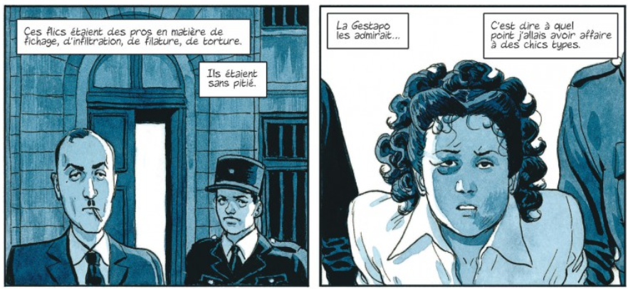 Pour transcrire cette force, mais aussi cette fragilité et cette humilité, en même temps que ces temps incertains, Dominique Bertail continue dans ce style qui replonge dans l’Histoire, cette monochromie de bleu qui donne à voir un Paris comme saisi par la photographie, où seuls les visages sévères et laids des collaborateurs rappellent que l’on se trouve dans une bande dessinée, là où les résistants et résistantes sont enveloppées d’une aura quasi angélique, accentuant cette opposition entre le Bien et le Mal par le dessin. Petite nouveauté, lorsqu’à la fin "Rainer" reçoit le commandement d’une unité, elle est terriblement badass malgré sa voix muette et sa fatigue, teintée d’une assurance de prisonnière rescapée, de l’expérience accumulée alors qu’elle n’a pas encore fêté ses vingt années...