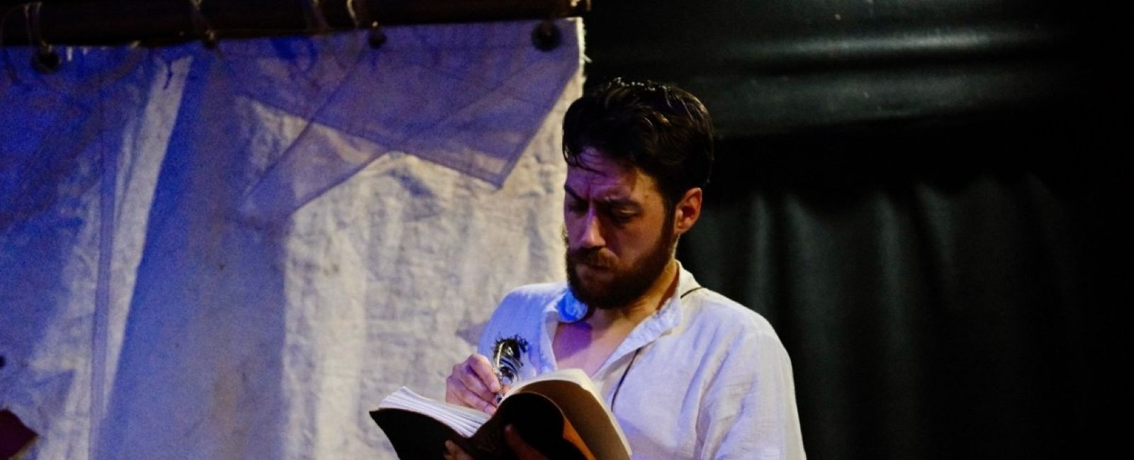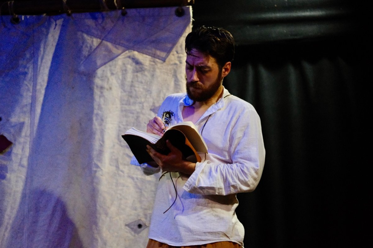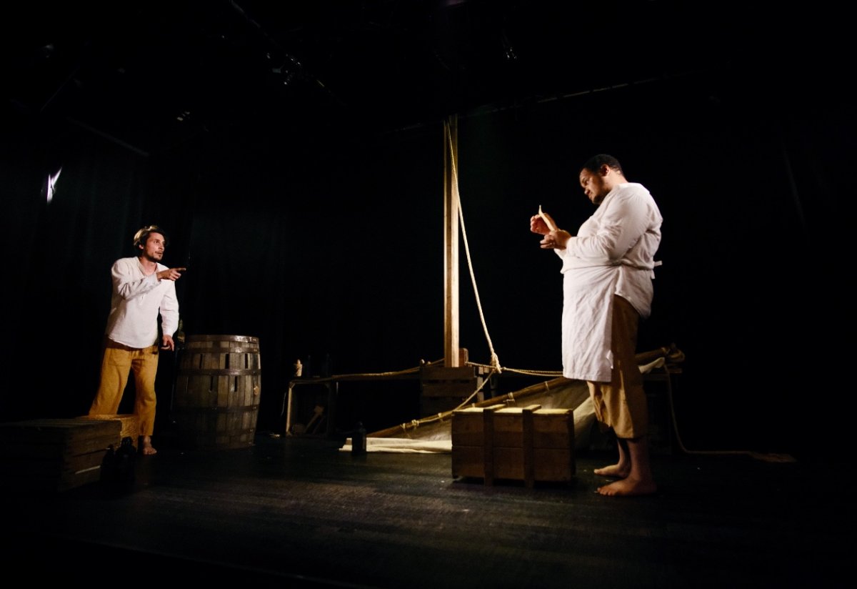 Sur fond de ressac et devant un calicot orné de la croix catholique du royaume d’Espagne, une troupe de cinq comédiens dynamiques et investis nous immergent au cœur du quotidien de marins, ballottés au gré des cahots de la mer, de l’humeur de leurs supérieurs et des tempéraments divers de leurs coéquipiers, affrontant avec courage et solidarité les mauvais traitements, la faim et la mort. Une mise en scène astucieuse les amène à se déplacer entre la salle et le cœur du plateau où sont installés tonneaux, malles, mâts et autres objets évoquant la vie à fond de cales, dans les ports et sur les flots. Une manière efficace de mettre le spectateur au cœur de l’action et de lui faire partager la personnalité, les attentes, les peurs et la détermination de chacun de ces hommes. Si le rythme est indéniablement vif, il fléchit pourtant à l’heure où les bateaux retenus par une météo sans vent nous enferment dans une nuit sans fin. Une légère baisse de régime qui n’entame cependant pas la beauté de cette page d’Histoire souvent méconnue, dont le plus bel intérêt est de célébrer la puissance créatrice de l’homme dès lors que la passion décide de passer outre l’adversité.
