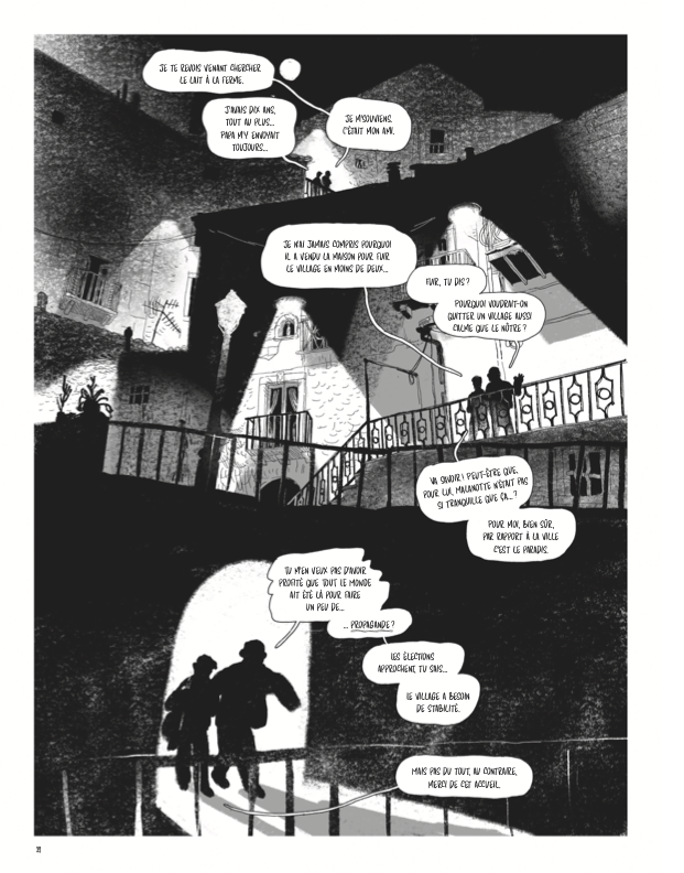 Critique : Deuxième album de la collection « Aux confins » après Au-delà de Neptune, Malanotte est l’œuvre d’un duo italien talentueux composé de Marco Taddei (scénario) et La Came (dessin) qui explorent le folklore rural italien. L’histoire se situe dans les années 1970, au moment où la modernité entre dans la plupart des foyers et où le retard des villages les plus isolés apparaît de plus en plus criant. Symbole de la modernité urbaine avec son magnétophone et ses études universitaires, Ernesto apparaît immédiatement comme un corps étranger et fait figure de curiosité auprès des habitants dans un village en apparence paisible. Toutefois, le poids du regard des autres est lourd, comme le héros ne tarde pas à le découvrir lorsqu’il échange avec Sarah, une jeune femme de son âge qui s’occupe de sa grand-mère très âgée. Sarah occupe avec sa grand-mère l’ancienne maison du père d’Ernesto, ce qui rappelle des souvenirs à ce dernier, et réveille au passage quelques interrogations…
