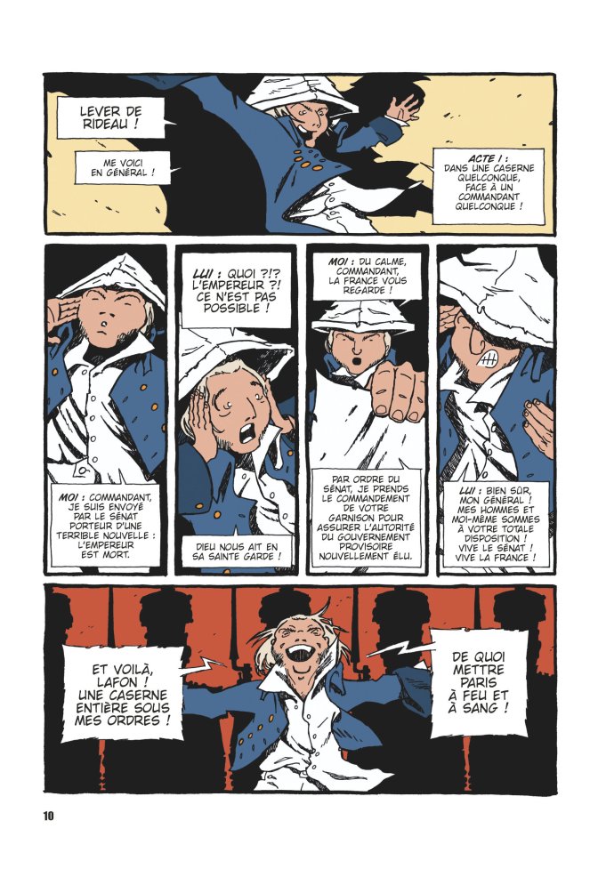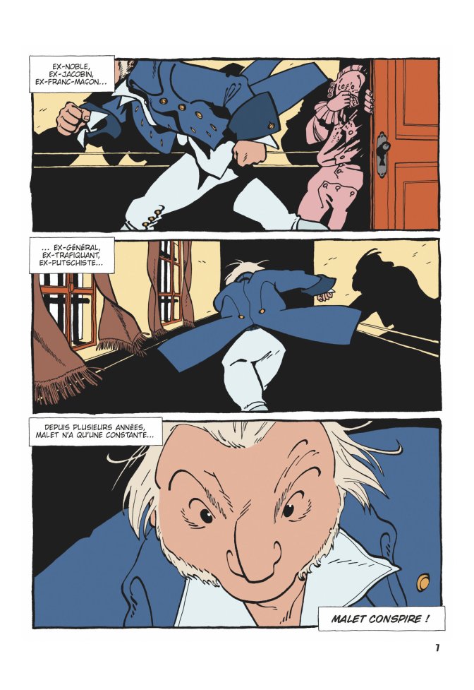Fidèle à la réalité historique, l’album vaut d’abord pour sa galerie de personnages – Lahorie, Guidal, le caporal imbécile promu « aide de camp », le jeune arriviste – et son histoire en forme de vaudeville, qui culmine par la confrontation (vraie !) entre Malet et le ministre Savary (et que dire de l’évasion de ce dernier...), puis avec deux généraux fidèles à l’Empire. On est frappé par la bêtise des uns, et par l’audace des autres. L’ensemble s’achève par l’échec des conspirateurs, qui paient de leur vie le prix de leur tentative. Toutefois, l’Empire a témoigné de sa fragilité : deux ans plus tard, les armées coalisées viendront (une première fois) à bout de Bonaparte.