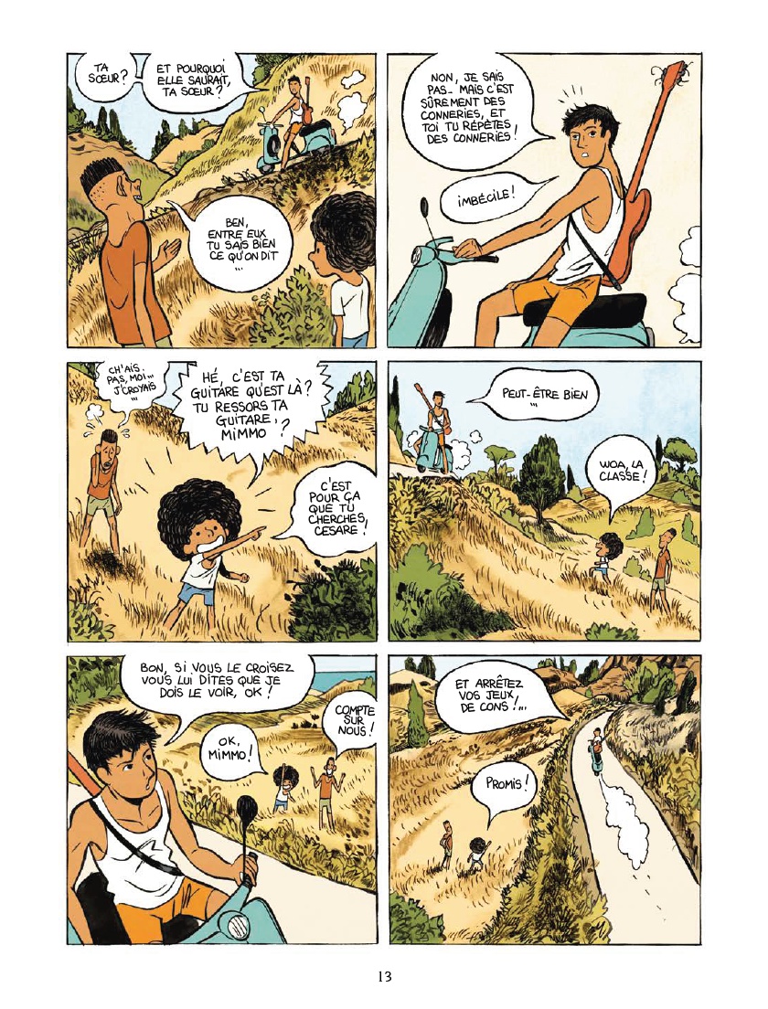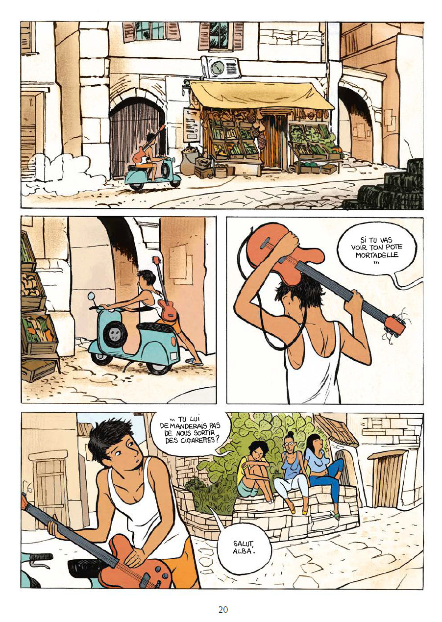 Critique L’histoire se passe dans une petite ville au bord du littoral azuréen. Où ? Rien ne nous permet de le dire exactement. Une seule ville est nommée dans l’album : Scamorza, comme le nom d’un fromage de l’Italie du Sud. Alors on imagine que l’histoire se déroule dans le sud de la botte. Il fait beau, le ciel est bleu et les jeunes gens sont en chemises courtes ou en maillot de corps sur leurs deux roues motorisées.