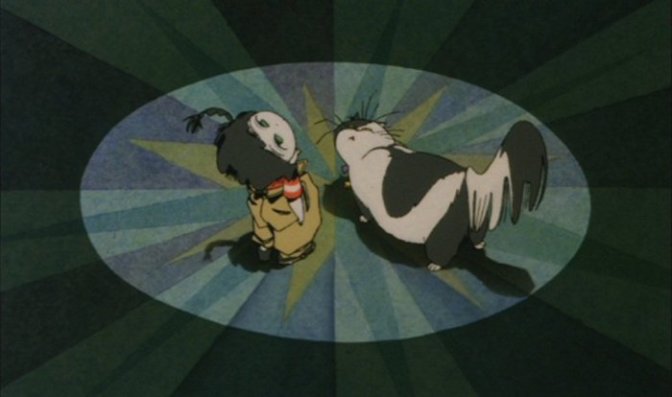 Trois courts-métrages le composent, sans logique ou continuité thématique. Trois réussites intégrales. Manie Manie : Les histoires du labyrinthe (le nom complet du recueil) ne manquera jamais d’interpeller son spectateur sur ce à quoi il assiste. C’est à plus forte raison avec Labyrinthe, sketch introductif du projet, que cet état de fait prend toute son envergure. La lourde charge d’ouvrir le bal revient donc à Rintarô (Metropolis), qui livre par la même occasion le segment le plus envoûtant de cette trilogie. Un film audacieux, perturbant et énigmatique qu’il est difficile d’analyser tant sa valeur semble se trouver dans les émotions qu’en retire celui qui le voit. Car s’il conte l’aventure d’une petite fille qui cherche son chat avant de passer avec lui au travers d’un miroir, Labyrinthe est finalement une œuvre mentale et abstraite qu’il convient de ne pas rationaliser. Peut-être est-il question de temps, comme le prouvent l’horloge et le nom du cirque présenté (« Le tour du cadran »), d’imaginaire (le chapiteau se situe « rue du chat »), mais éventuellement aussi de tant d’autres choses. Un guide bizarre aux allures de clown qui dirige la gamine et son animal, un univers illogique où un chien invisible peut côtoyer des fantômes et des êtres silencieux qu’on ne peut définir, une bande-son noyée dans la perfection (et quasi-muette en terme de dialogue) ou une animation exceptionnelle mêlant de façon harmonieuse impressionnisme et expressionnisme : au fond, peu importe que la narration nous embarque où elle le veut. Labyrinthe est une expérience sensorielle intense, dont la trop courte durée ne fait que contribuer à un concert d’éloges quant à son existence même (combien peuvent procurer tout cela en seulement dix minutes ?). L’ouverture de rideaux annonçant la seconde partie du festin est frustrante et empêche tout questionnement : en considérant sans le moindre recul ce que l’on vient de voir, il est impossible de prévoir la nature de ce qui va suivre. Et au final, inutile.