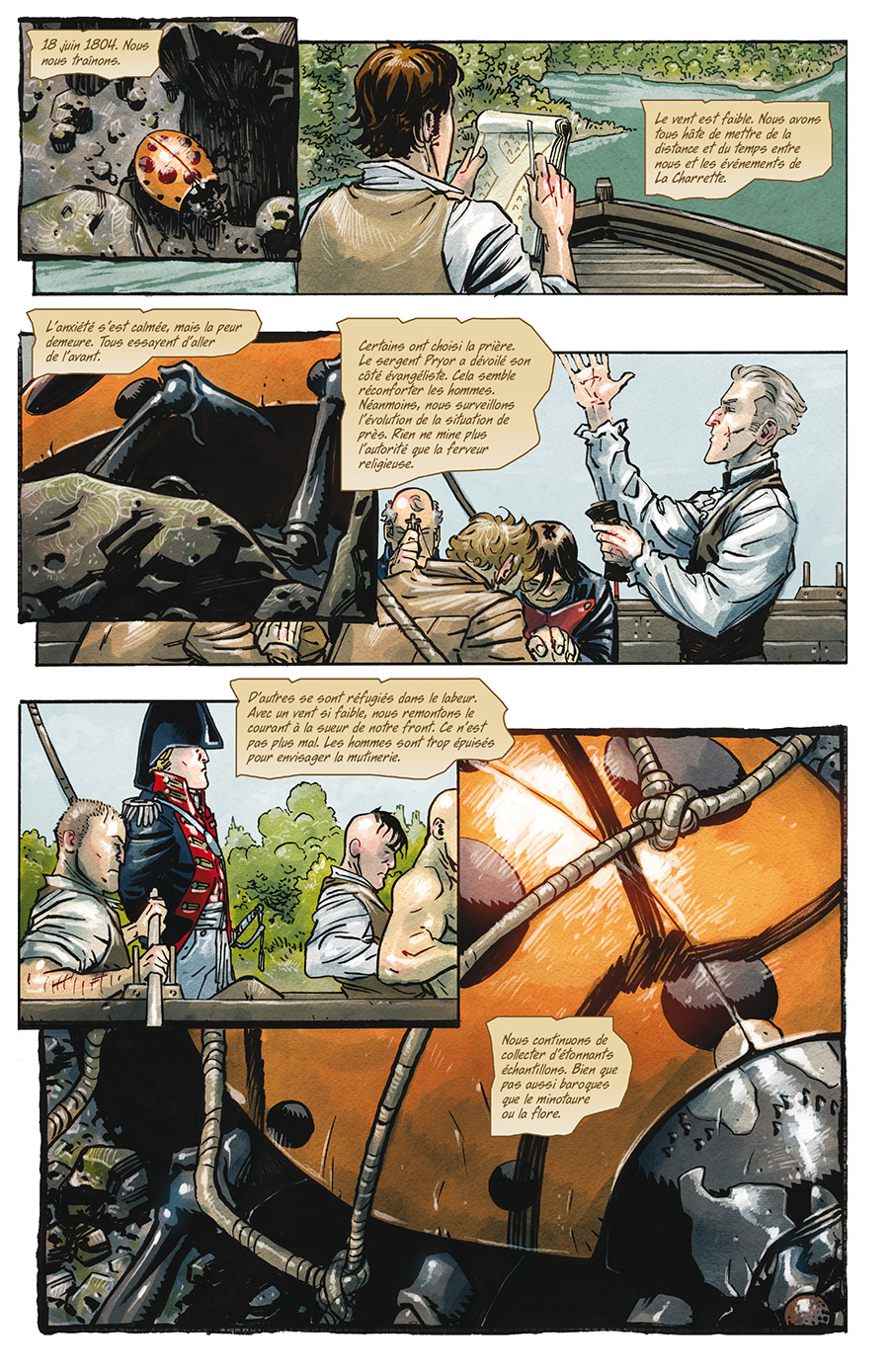 Cette marque se retrouve dans le dessin, toujours percutant et vivant. Matthew Roberts a clairement une patte comic sympathique, où l’on pourrait retrouver un mélange entre l’ambiance de Léo dans la traversée de Bétélgeuse et les traits façon Adlard et Walking Dead (en couleur). Le fait de relater les aventures à la façon d’un journal de bord est intéressant, même si des ellipses, notamment en fin de tome, sont un peu frustrantes pour le lecteur. Si certaines planches sont surchargées, la densité d’action et de réflexion permet de ne jamais s’ennuyer, de toujours être aux aguets face à la nature ou envers les personnages aux contours sombres, qu’ils l’assument ou qu’ils le cachent. La destinée américaine prend donc un sacré coup avec ce groupe d’explorateurs prêt à tout pour parvenir à leurs fins, qu’ils soient au nom du pays ou de leurs pulsions...