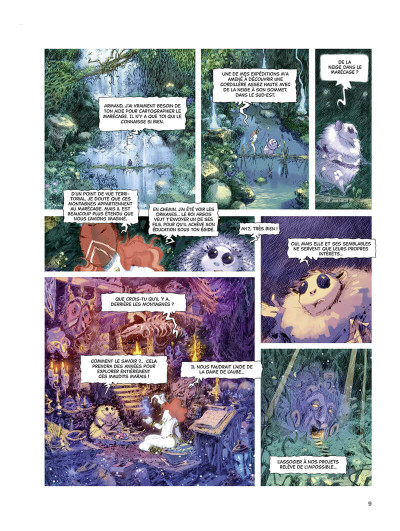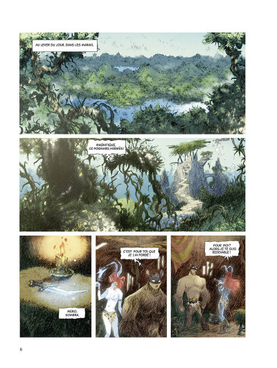 Le style graphique, quant à lui, se trouve proche de celui d’un certain Loisel, dont l’association avec Le Tendre a donné l’excellentissime saga de la Quête de l’Oiseau du Temps. Ce style, il se retrouve dans les yeux petits et vitreux de certains personnages, dans cette nature à la fois luxuriante et hostile, dans ces tavernes et quelques palais d’un Moyen-Âge assez poreux, gangréné par les cabales et les ruses, où le marécage révèle plus la violence du monde qu’il ne la génère. Des races nouvelles, entre elfes, démons, hybrides se mouvent sans avoir encore de noms ou d’histoires, mais leur apparence physique indique une hétérogénéité qui là encore distinguait les tomes de la Quête, leurs marches et leurs différences. Or ici, dans le Marécage, tout le monde vit et meurt, sans que les races n’aient quelque chose à voir...