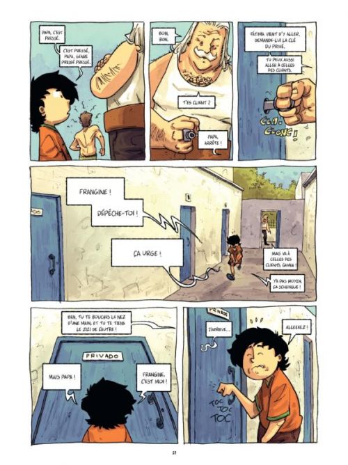 Le dessin place d’ailleurs le comique au-dessus de la mêlée : clairement, Isaac Sanchez ne veut pas se prendre au sérieux, pas question pour lui de styliser à la manière d’un roman graphique américain un traumatisme, hors de question de pencher vers le pessimisme et le négatif lorsque resurgissent des éléments plus triste, voire un cauchemar. Non, même abattus, à l’image du patriarche, les personnages conservent une dignité et surtout une jovialité qui les rend attachants, les jeunes comme les anciens, et ils peuvent ainsi vaquer sur la plage, dans les rues et bien entendu dans les couleurs du baños comme bon leur semble, même si tout y est gris et décrépi, car leur vie y a été belle et lumineuse.