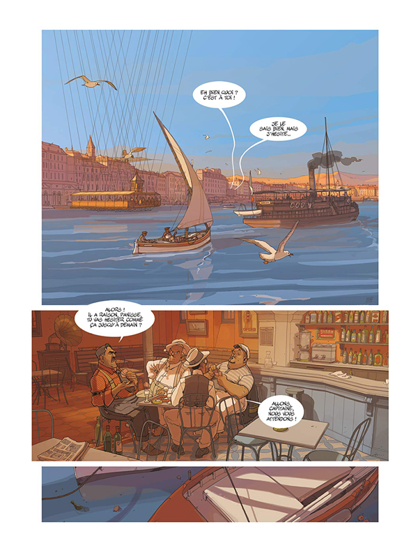 Les compositions simples des pages avec ces cases dépourvues de contour sont certes serrées, permettant l’avancée de l’action, mais elles laissent la place tout autant aux clients du café qu’aux héros de cette histoire. Car finalement, Marius donne le titre au récit, mais on s’attache également et surtout à toute cette galerie de personnages secondaires qui le temps d’une séquence, prennent le devant de la scène.