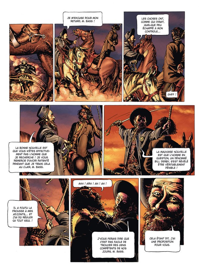 Cette dualité se retrouve dans le dessin, qui peut faire penser au style des comics urbains américains , de type Spiegelman, irrévérencieux avec des scènes d’action qui semblent figées, des visages un peu caricaturaux et des couleurs criardes. Pourtant, ce style graphique arrive à créer des pages étonnamment sombres, une ambiance pas loin d’être glaçante par certains aspects. En fait, on s’attend à ce qu’il se passe quelque chose de mauvais, une tension continue pour ce pauvre Marshall Bass, qui transparait bien grâce à ce style décalé, et inédit pour un western.