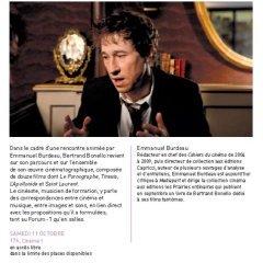 Réalisateur incontournable de cette rentrée 2014, le réalisateur de L’Appollonide et de Saint Laurent, Bertrand Bonello, tiendra au centre culturel Pompidou, à Paris, le samedi 11 octobre, une Masterclass gratuite. Un accès libre pour un rendez-vous incontournable qui permettra à l’auteur de Tiresia de revenir sur sa carrière, l’une des plus atypiques du cinéma français de ces 15 dernières années, d’une exigence artistique totale.