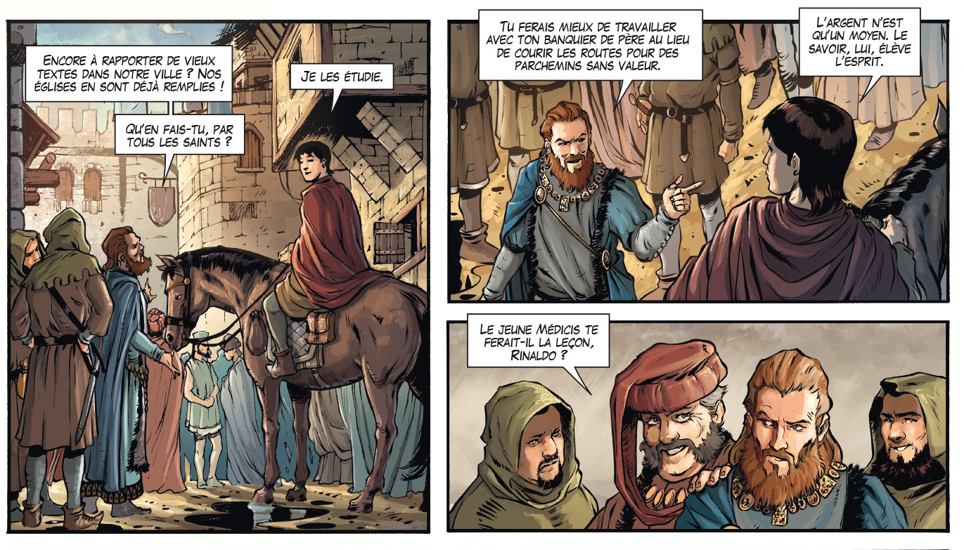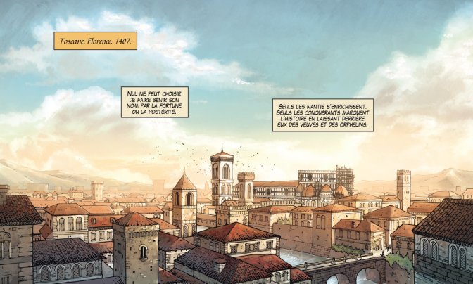 De fait, c’est un personnage complexe que l’on découvre : féru d’arts et de lettres, très intelligent et calculateur, initiateur du mécénat des Médicis, Cosme méritait bien qu’on lui consacre une bande dessinée. Force est de constater que Rinaldo Albizzi avait raison de se méfier de lui : on suit en effet son ascension, irrésistible et vertigineuse, une ascension qui le mène à la fin de sa vie jusqu’à la tête de Florence, après avoir évincé ses rivaux, par la ruse, et non pas par la force, qu’il considère dépassée.