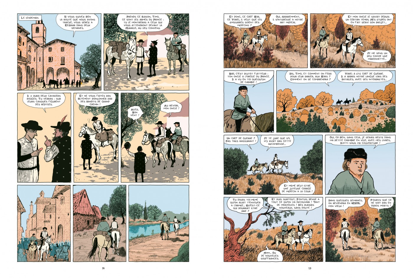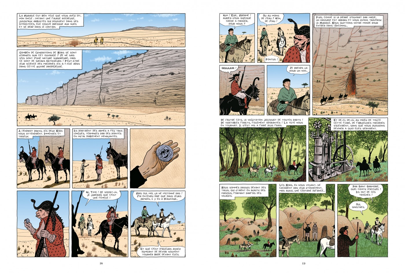 Un dessin humble, c’est aussi la caractéristique graphique de Nicols Puzenat, qui ne cherche pas à griffer un peuple à la manière des comics, pleins de muscles ou de couleurs, mais en fait des hommes à l’aspect brutal mais à la sagesse éloquente. Les palais y sont comme les traditions, en accord avec la nature, et évidemment au début, on a hâte de se retrouver de l’autre côté du mur. Pourtant, les landes desséchées, les auberges crasseuses et les austères monastères avaient déjà donné le ton d’un album qui se veut réaliste, dans un dessin pourtant fin, quasi fuselé, où les personnages et les décors ont un dénominateur commun : la simplicité et l’authenticité, et ce alors qu’il s’agit d’un univers parallèle uchronique.