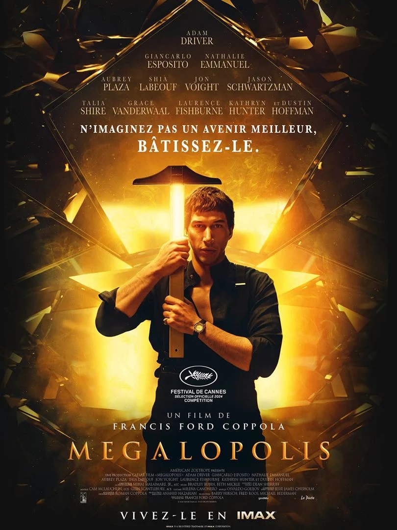 Megalopolis est incontestablement un des grands évènements de la sélection cannoise. L’œuvre qui n’a absolument besoin d’aucune publicité pour exister se suffit à elle-même. Le spectateur en prend plein les yeux, les oreilles et le cœur avec des comédiens tous parfaits, visiblement flattés de jouer auprès de Coppola lui-même. Il ne faut pas avoir peur de la démesure, de la grandiloquence et même de se perdre dans ce labyrinthe de sons, couleurs et lumières absolument fantastique. Le spectateur en a vraiment pour son argent, ce qui, il faut le reconnaître, est une aubaine avec la multiplicité des sorties hebdomadaires et les prix du billet qui ne cessent d’augmenter. Le long-métrage emprunte des ressorts mythologiques revisités à l’aune de l’émergence des nouveaux enjeux sociétaux en matière de pollution, d’intelligence artificielle et de perte de repère et de sens des populations du monde.