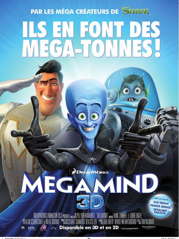 Les studios Dreamworks enchaînent les films, « Megamind » est déjà leur troisième de l’année ! Après un excellent film de Vicking et un tout dernier « Shrek » sans surprise, le studio s’attaque aux super-héros ! Si certains pensent qu’il s’agit là d’une pâle copie des « Indestructibles » du maître Pixar qu’ils jettent un oeil au script original et audacieux de ce nouvel opus animé. Ici le héro est un méchant, pas bien doué d’ailleurs ce Megamind, pourtant c’est bien lui qui va anéantir le super-héro local MetroMan, star incontournable, et prendre le pouvoir de la ville. Mais force est de constater que sans gentil, il est bien trop facile d’être méchant... Le personnage bleu au crâne disproportionné va en venir à confectionner un futur rival mais tout ne va pas se passer comme voulu ... A travers son « Megamind » le studio connu pour son humour parodique s’attaque aux comics et ne cache pas ses références. Ici les super-héros sont de véritables stars, mettent en scène chacune de leurs apparitions, il y a beaucoup de second degré et une intelligence assez incroyable pour un film d’animation. Le scénario pose beaucoup de questions sur ce que le bien et le mal, sur ce qui motive une personne à devenir ce qu’elle est, la part du choix, du hasard ... Des petits retournements de situation malins, pour livrer un film assez atypique, à l’image de ses personnages et de leurs physiques peu communs, un schtroumpf au crâne surdimensionné, un acolyte mi poisson mi robot, Mr muscle ou encore la fille tant convoitée aux cheveux courts, taille guêpe mais aux hanches et à la poitrine généreuses. S’il ne s’avère pas aussi drôle que le récent « Moi moche et méchant », l’humour est appréciable tout autant que sa BO survitaminée, et ses petites touches d’émotions et de morale jamais mièvres. Au niveau graphique rien à redire, si la 3D n’atteint pas le niveau de « Dragons » elle est de bonne qualité, ce qui n’est pas le cas du doublage français .. Si Frank Dubosc donne avec sa voix un petit plus comique à son personnage, la voix de Kad Merad m’a vraiment dérangé par moments... Au final « Megamind », sans exceller, s’avère être un bon film d’animation inventif et divertissant. Une réussite de plus pour le studio, qui prouve qu’il ne sait pas que faire rire !