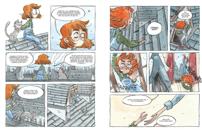 Son chat ayant la sournoise idée de s’aventurer sur le toit pendant que la petite reste pensive, elle tente de le rattraper. Mais elle glisse, sauvée in extremis par un vieux sage à l’étage du dessous...