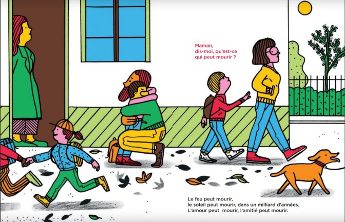 Critique : Conce Codina et Aurore Petit nous convient à une promenade philosophique sur le thème de la mort. Si ce sujet peut effrayer voire tétaniser certaines personnes (pour la plupart des adultes prisonniers de l’angoisse de cette inéluctable fin), il est ici approché avec un naturel et une simplicité qui dédramatisent immédiatement ce que cette notion peut avoir de terrifiant. Bien qu’évidentes, les questions étonnent toujours et les réponses détonnent d’autant plus : Conce Codina n’épargne aucun angle et au contraire approfondit chaque problématique par de nouvelles perspectives. Les réponses de la maman n’épargnent personne et font montre d’une grande honnêteté, témoignant d’une volonté de parler enfin franchement à la jeunesse. Souvent pragmatiques, les énumérations qui suivent les interactions du garçon changent doucement de registre et passent de la notion stricto senso de décès, pour investir une traduction plus imagée de la mort, mot qui peut recouvrir aussi les concepts d’achèvement ou d’aboutissement. À travers ces interrogations s’insinue de manière entêtante l’importance de la vie, fondamentale, sans quoi la mort n’existerait pas. L’enfant ne se lasse pas de questionner sa mère sur le sujet, et elle-même semble amusée par l’exercice, laissant suffisamment de latence pour inciter à poursuivre la réflexion. Ainsi, à l’énergie du fils répond la malice de son interlocutrice, qui s’exprime autant avec les mots qu’elle se répand dans l’image.