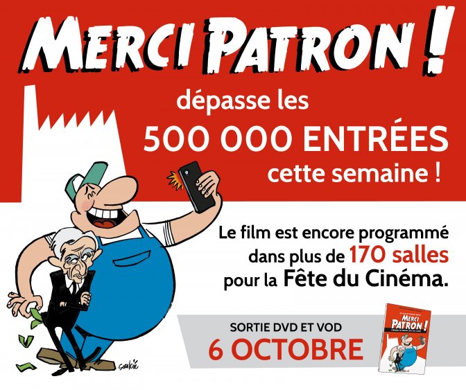 Documentaire événement qui a secoué le box-office français pour devenir le film le plus rentable de 2016, Merci Patron clame aujourd’hui 500.000 entrées.