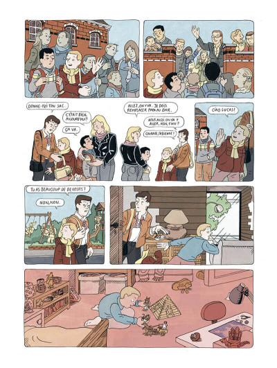 Pour parler du style graphique, il faut être honnête et reconnaître que comme pour le thème, le dessin n’était pas immédiatement engageant. Dans un style qui rappellerait presque Hergé, avec des personnages peu avenants aux corps tassés, aux mines sans sourires se dégage une impression de froideur que le temps et le ciel dans le décor accentuent. Et pourtant, comme si c’était un miroir vraie de la quarantaine, moment où les corps s’abîment, où la fatigue liée aux enfants, au travail et à la vie en général portaient des coups au physique, ce style s’impose dans la durée, honnête lui aussi, vrai et dur.