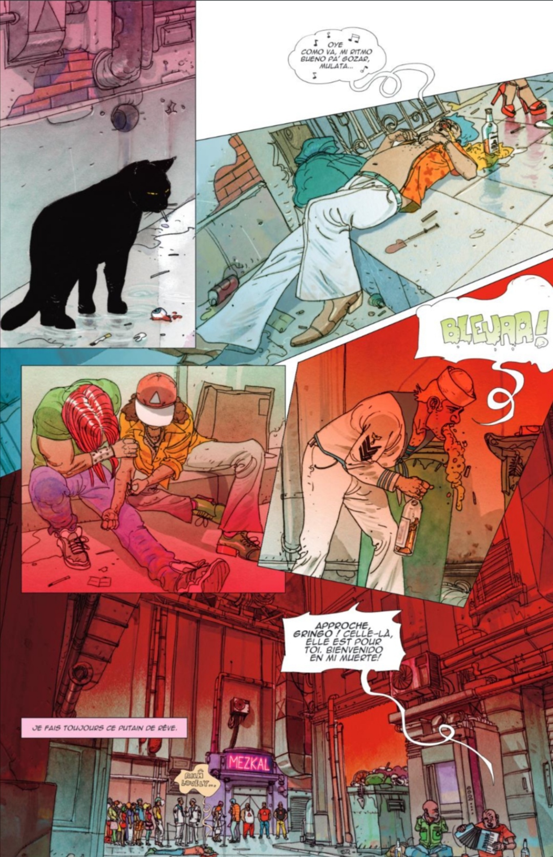 D’entrée, il y a une séduction qui s’opère avec Mezkal. On se sent replongé dans un Juan Solo de Jodorowsky, on voyage dans un far west moderne, où le sérieux d’un Sicario s’arrêterait lorsque paraissent les gueules rectangulaires des gangs de motards qu’un One Piece ne pourrait pas renier. L’histoire est un détail, le but un bonus, seul la péripétie compte pour ce héros qui fait des rencontres. Rarement adjuvant, à l’exception d’un garçon aveugle et d’un vieux shaman, souvent opposant, mais aussi traîtres mêlant les deux, comme cette indienne charismatique et possédée, ou ce nain agent de la CIA, les personnages foisonnement et fonctionnent, même lorsqu’ils sont poussés jusqu’à la caricature. Il y a une liberté qui se dégage de cette trame, où le héros Vananka va revivre tel un Spike Spiegel (de l’anime bien entendu), pour se refaire tuer aussi sec, poussant une vengeance inachevée et inutile face à la misère de la réalité et à celle abstraite des rêves.