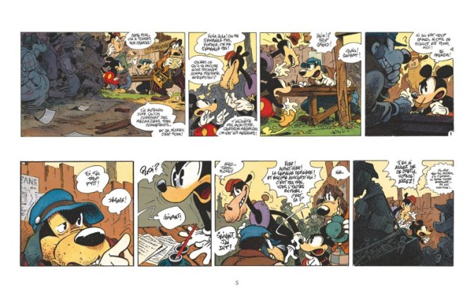 Pour ce grand retour, l’artiste s’offre un rêve : livrer son hommage au Mickey de Floyd Gottfredson des années 1930 dont il est un fan absolu. Faisant le choix du format « à l’italienne », l’auteur retrouve ainsi l’esprit des strips horizontaux caractéristiques de l’époque. Il livre une aventure rythmée et pleine d’humour où, comme souvent chez lui, les péripéties de ses personnages et la fausse légèreté du récit sont un prétexte pour aborder des thématiques profondes. Qui aurait imaginé Mickey traverser la crise de l’emploi dans l’Amérique post-1929, subissant les dérives du capitalisme et l’aliénation des masses laborieuses ?!
