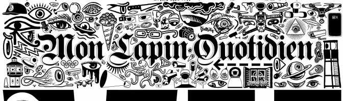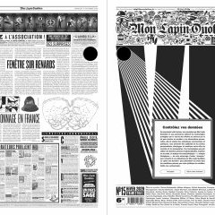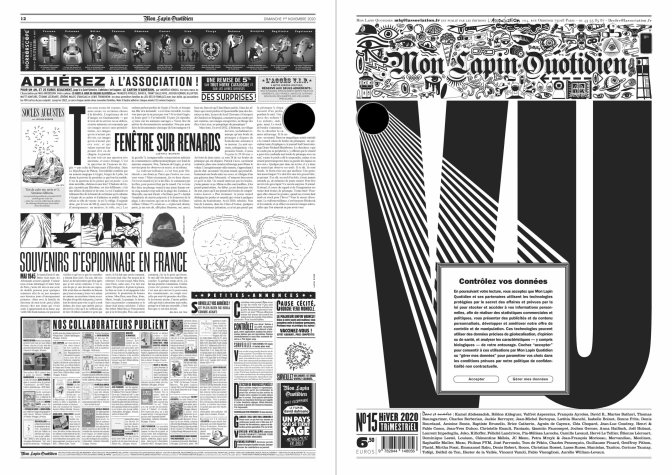 Mon Lapin Quotidien n’a donc plus de Lapin que la dimension collective et de quotidien le format (il parait à un rythme de quatre numéros par an, périodicité adéquate compte tenu de sa densité). Il apporte son lot de réjouissance, à commencer par cette impression de fulgurances créatives, d’expérimentations tous azimuts et d’effervescence artistique qui fusent dans les grandes pages de cette publication, tout en préservant une élégance graphique et une hauteur intellectuelle remarquables. Le numéro d’hiver de ce journal se distingue par la création de deux trous proches de la tranche, qui permettent de surveiller son voisin tout en faisant semblant de lire le journal, escamotant des parties de textes et d’images (les ronds de papiers découpés sont disponibles pour les abonnés qui pourront reconstituer les pages trouées). Cette facétie finit d’intriguer le lecteur et de signer la liberté de la publication.
