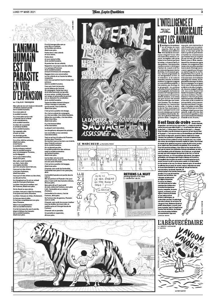 Après des numéros tournés des thématiques politiques et sociales, Mon Lapin Quotidien explore celle de l’animal. À ce sujet très large mais ô combien évocateur, les auteurs répondent avec des propositions qui se révèlent tantôt légères, tantôt plus engagées, parfois simplement amusantes, toujours foncièrement intéressantes. L’hétérogénéité de la rédaction est toujours à la mesure de sa richesse : foisonnante, profonde, hétéroclite. Par-delà cette grande diversité, un esprit commun unit les auteurs de la revue, une dimension conceptuelle les lie comme elle peut associer dans un même mouvement des artistes aux pratiques divergentes : de fait, une hauteur conceptuelle et une grande exigence esthétique se formulent dans toutes les œuvres présentes. L’image et l’écrit entrent en dialogue visuellement et la mise en page place ces deux pratiques à un même niveau, sans hiérarchie, ce qui permet à chaque partie de se revitaliser, de se porter voire de s’élever à travers des échos anticipés ou fortuits. La force et l’originalité de chaque contributeur participent à la richesse collective du numéro qui se révèle des plus stimulants. Cette profusion de singularité artistique peut donner l’impression de découvrir un opus de la revue Dada ou du Chat noir à l’époque de leur publication, mais cette fois-ci évoquant notre époque, arborant la modernité graphique et intellectuelle de notre temps.