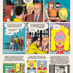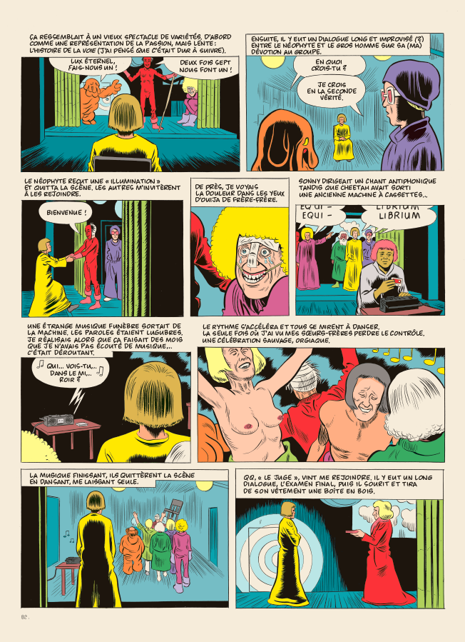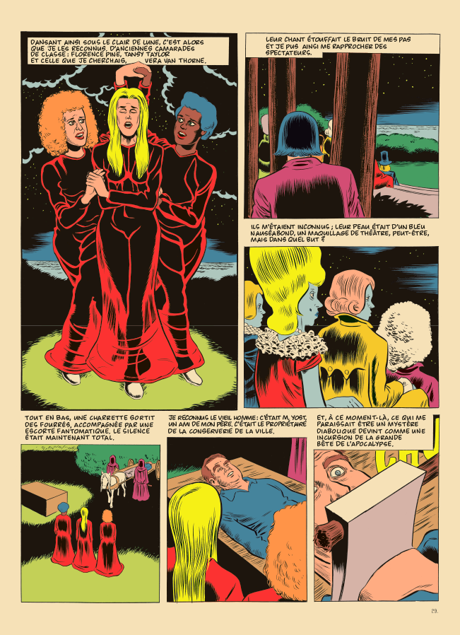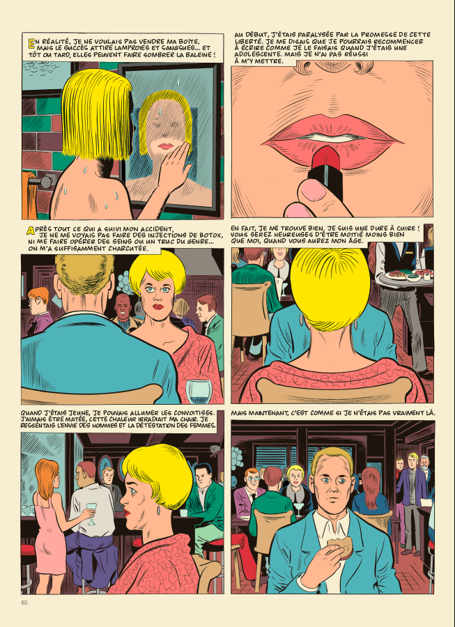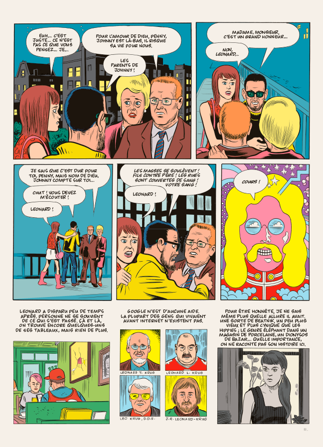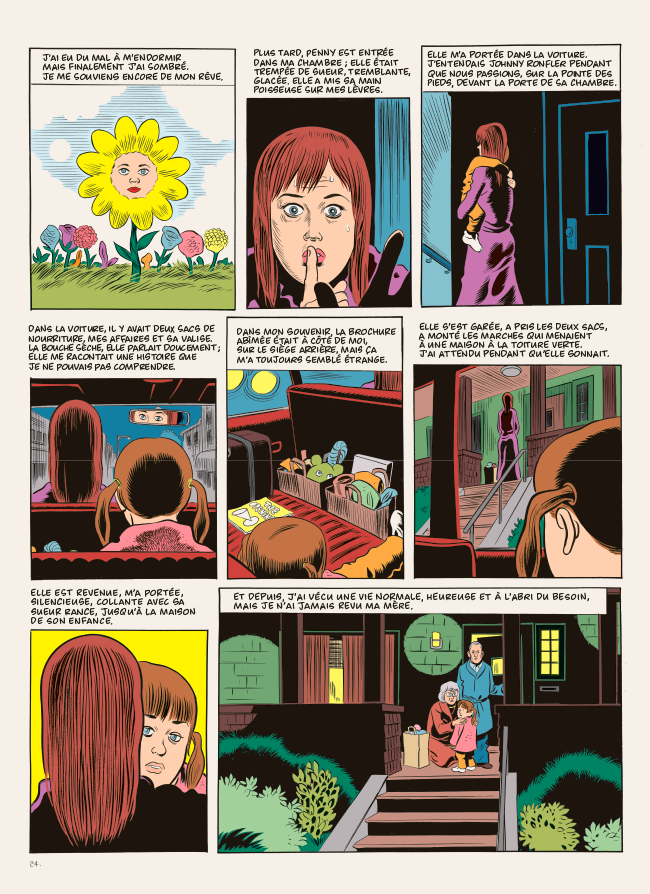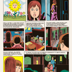 Clowes sait également trouver les mots justes, notamment en peuplant ses descriptions de détails (parfois placés entre parenthèses) qui précisent une attitude, une ambiance… Au fil de ces pages, il dresse un portrait détaillé, tendre mais également flippant, des États-Unis et de plusieurs décennies.