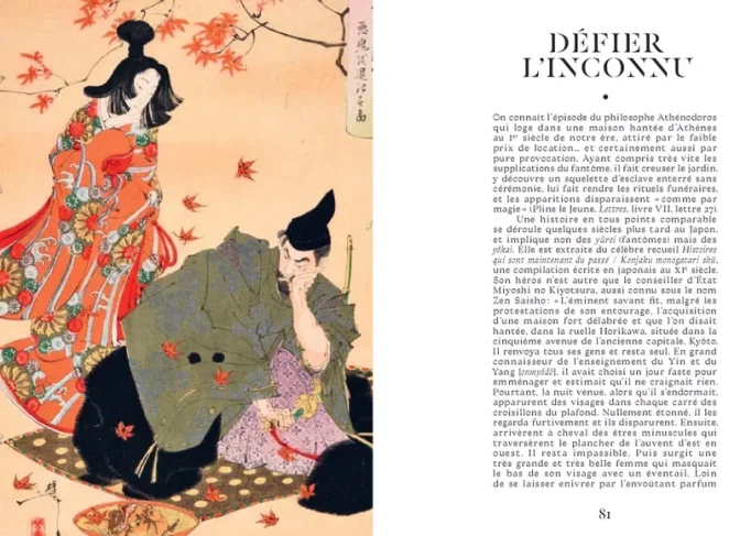 Philippe Charlier écrit les textes de ce livre, revenant sur des grandes légendes du monde des yokai. Les multiples peintures sont des détails d’œuvres de grands artistes tels que Utagawa Kuniyoshi, Tsukioka Yoshitoshi ou encore Toriyama Sekien.