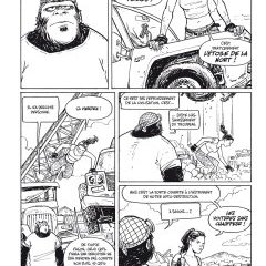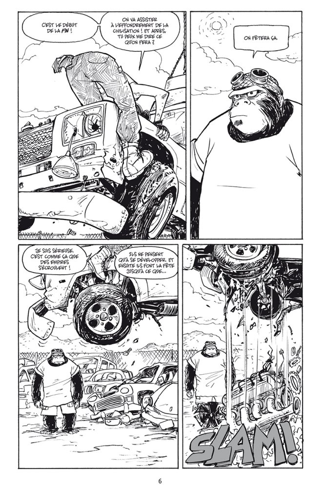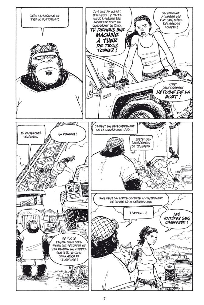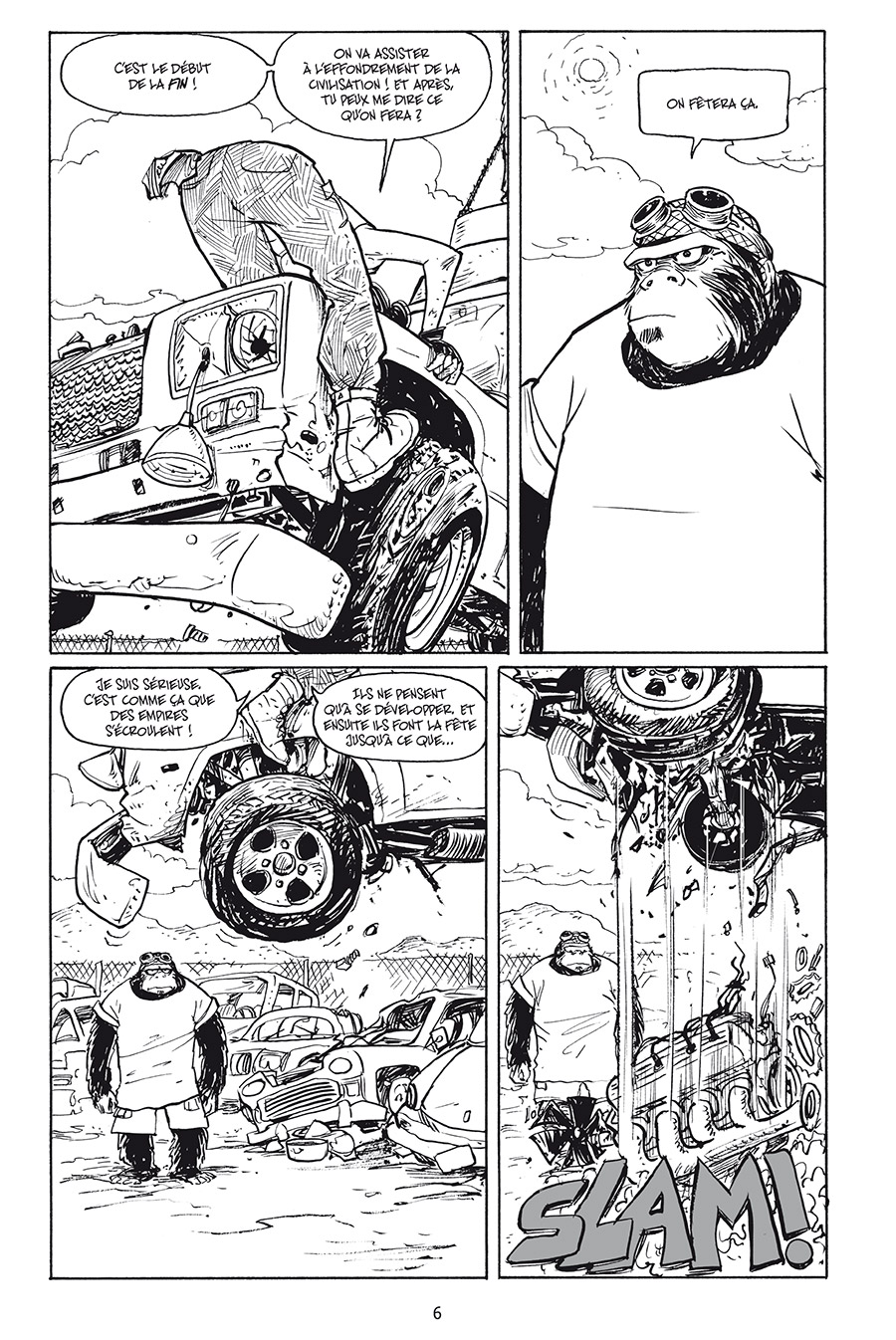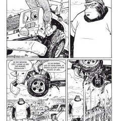 Le dessin noir et blanc, presque vide, éclatant de blanc, a un côté rebutant au premier abord. Cette abondance du blanc,ce caractère vierge finit cependant par s’estomper, par s’oublier, et laisse la place pour imaginer les couleurs : l’ocre du désert, le vert des aliens, l’écarlate du sang... L’héroïne et son joli minois fait presque figure d’OVNI au milieu de visages grotesques, presque caricaturaux, frôlant l’animal pour certains, et pas seulement le gorille. Le paysage, du désert à perte de vue, laisse une impression de vide, que la casse remplit bien, avec justement ce fouillis, sans ordre ni organisation, bien à l’image de la maîtresse des lieux et de l’histoire.