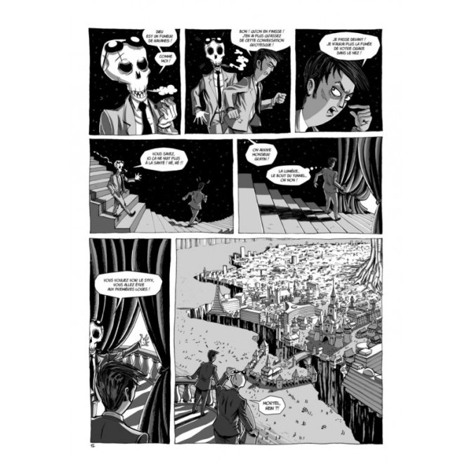 Gilles le Coz signe un premier tome drôle où se multiplient les références pop culture au gré des pages, références plus ou moins marquées pour vous laisser le soin de les chercher. A travers l’histoire de Jean-Paul Gratin, fraîchement décédé, pris en main par Monsieur Bone, James Bone, nous découvrons le monde de l’au-delà ou plutôt du par en-dessous. En effet, C’est vers le fond d’un autre monde que Bone entraîne l’infortuné Jean-Paul. Tout cela pourrait être bien angoissant si Bone ne désamorçait pas l’horreur d’un tel voyage par un humour noir de circonstance, auquel il est difficile de rester insensible.