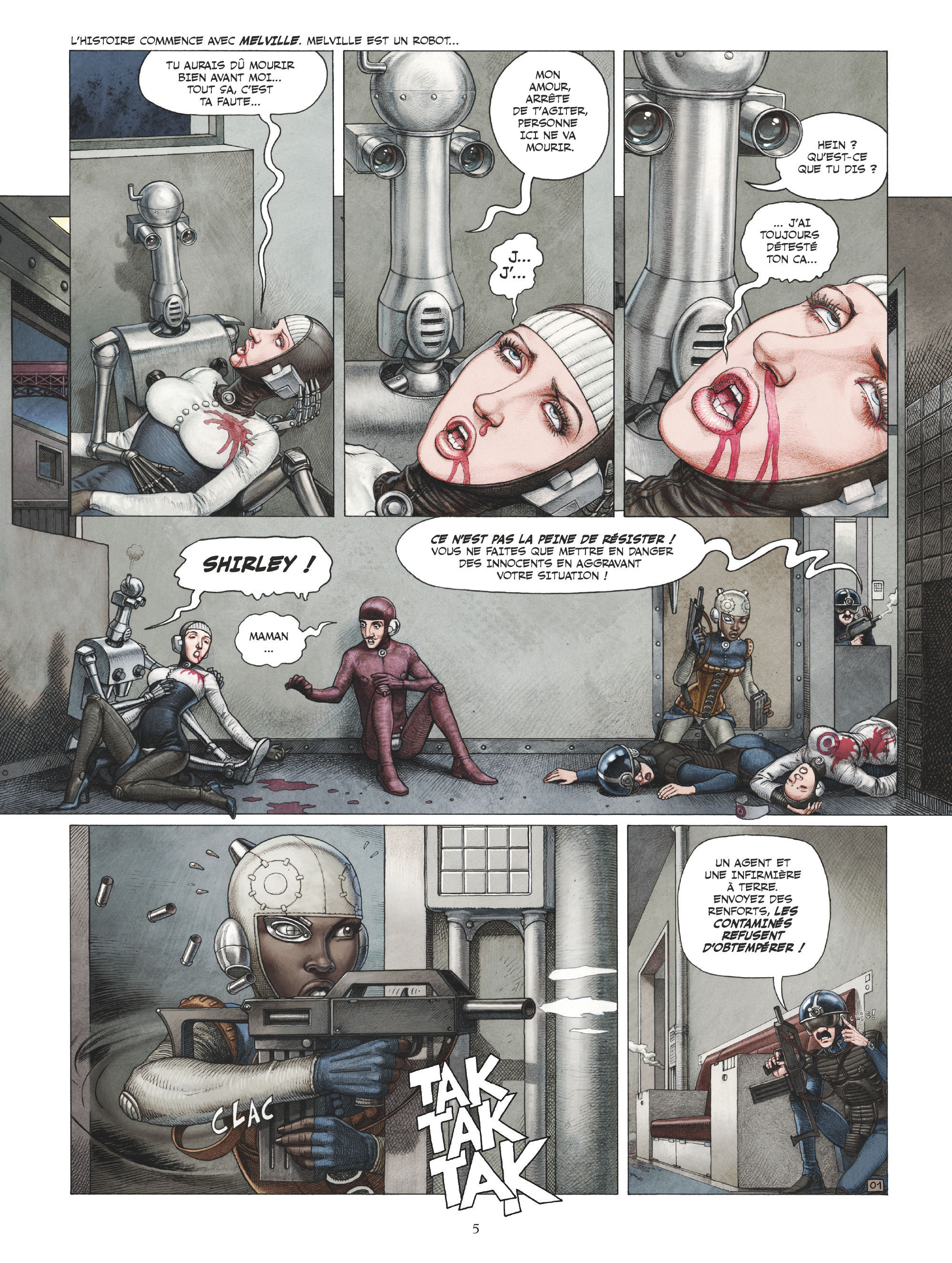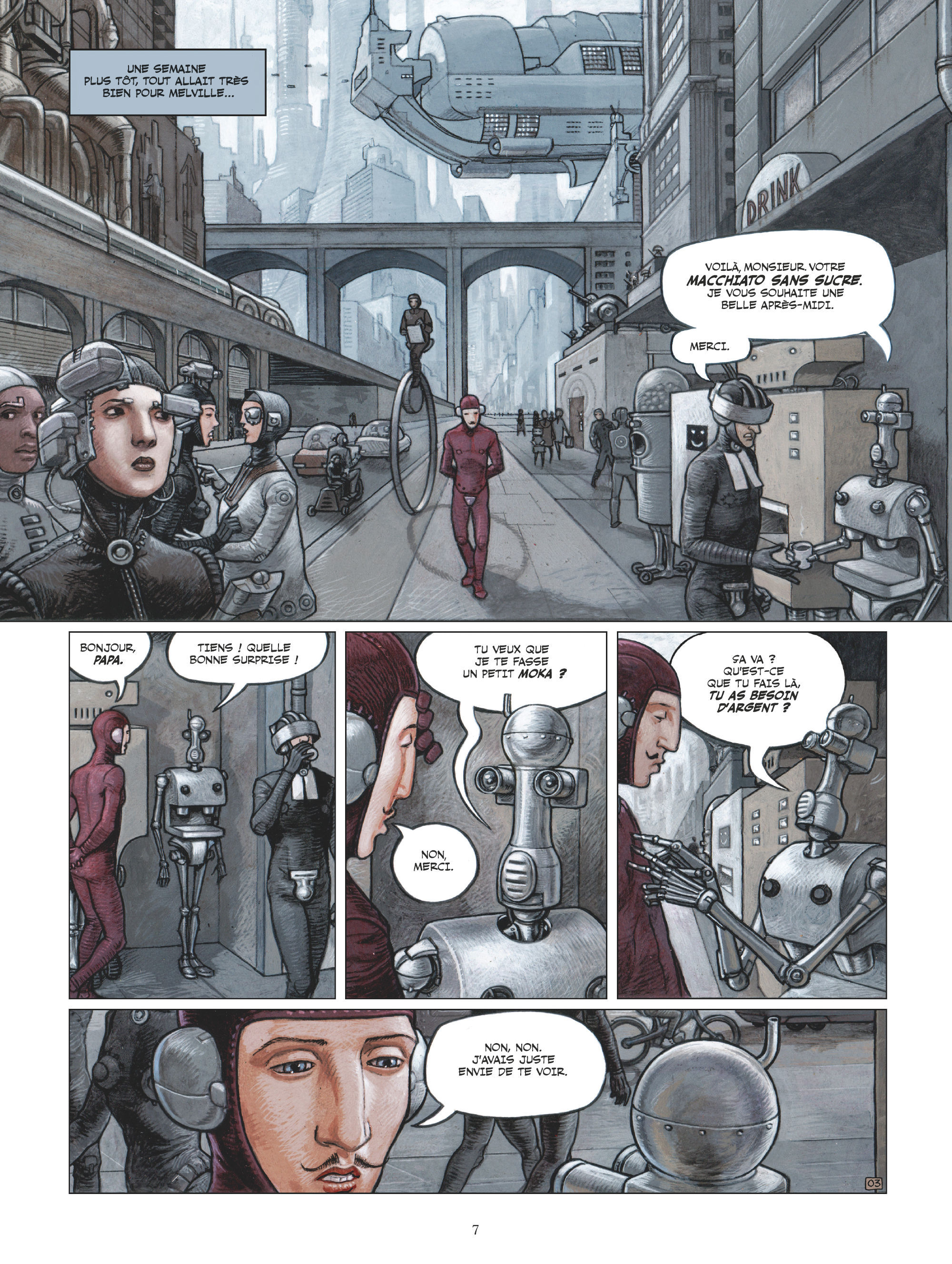 Résumé : Dans un futur lointain, l’humanité est divisée en deux catégories. Sous terre vivent péniblement les « survivants » d’une prétendue apocalypse nucléaire. À la surface les membres de l’élite vivent confortablement et surtout sont capables d’accéder à l’immortalité en réincarnant leur âme dans d’autres corps humains – pour les plus fortunés – ou dans des robots plus ou moins fonctionnels. Cette division est mise à mal lorsqu’une jeune femme des souterrains, Nathanaëlle, remonte à la surface…