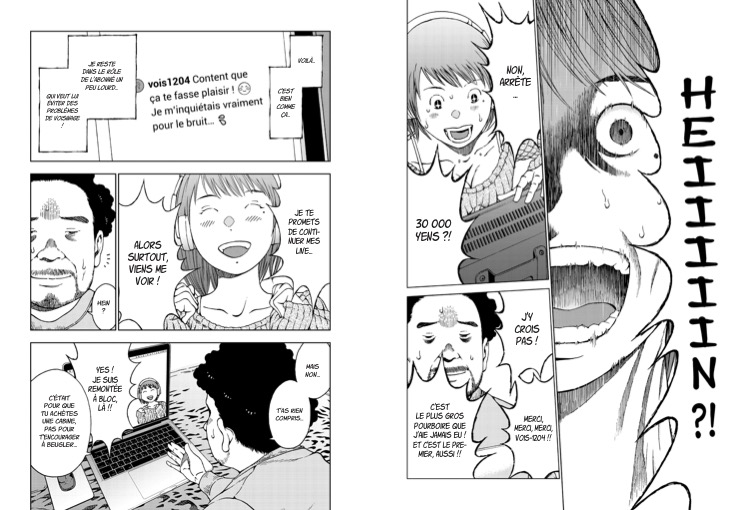 Mais si le début s’avère assez classique, plusieurs passages raccrochent le lecteur et, comme Kentaro, nous nous sommes fait bousculer par l’arrivée de la nouvelle voisine, la pétillante Sumika Iori, jeune étudiante qui passe ses nuits à jouer à Waste World en se filmant. Petit problème, elle fait énormément de BRUIT en jouant ! Et pour couronner le tout, elle est d’une nullité affligeante…. Pour notre héros, ancien accro à ce jeu, c’est très difficile à supporter. Il va donc décider de se créer un personnage et aider cette voisine indélicate. Espérant ainsi retrouver la quiétude de son appartement. Mais cela ne va pas se passer tout à fait comme prévu …