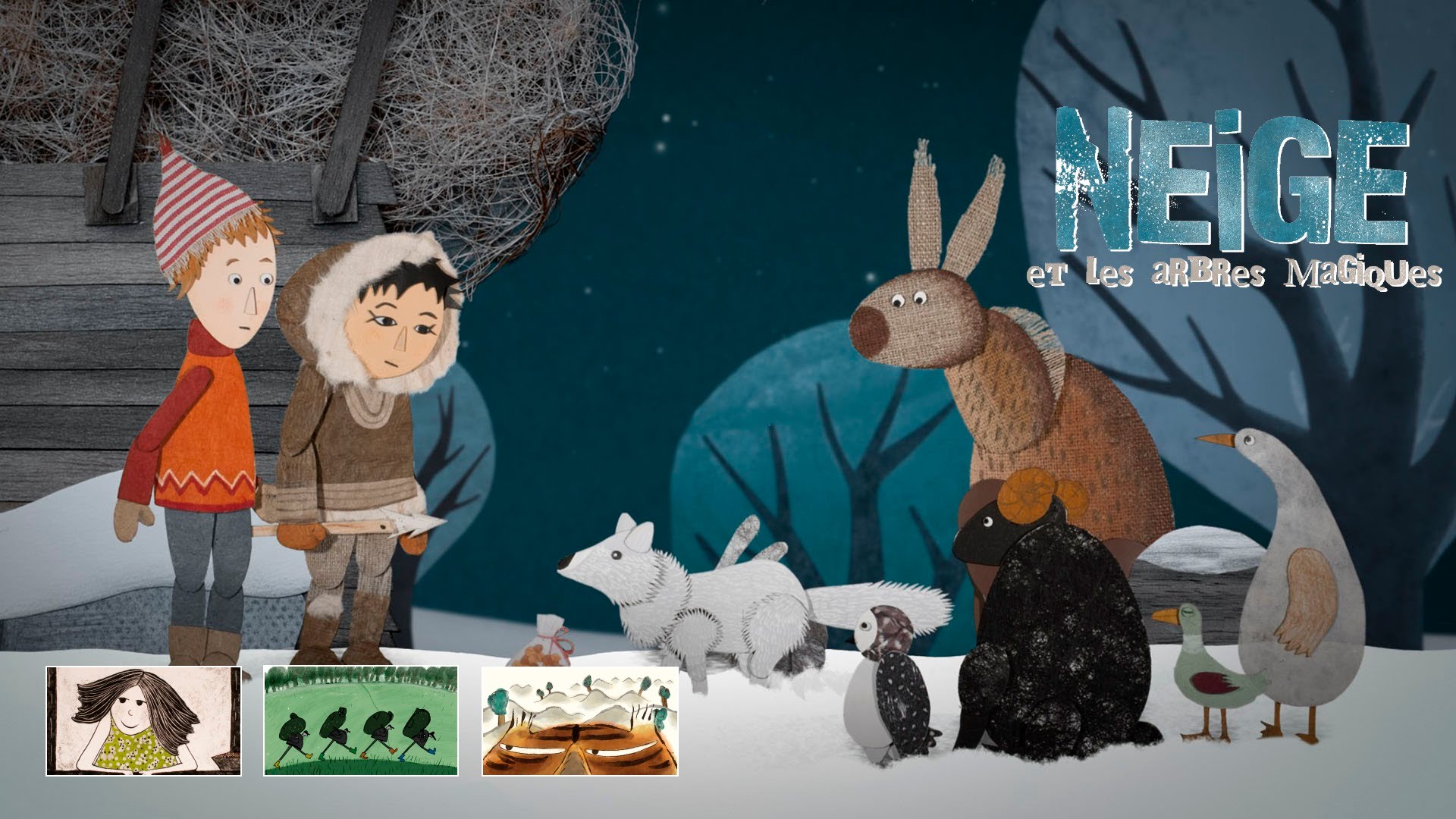 Notre avis : Le programme de courts métrages animés que propose Neige et les arbres magiques, nouvelle création du studio Folimage (La prophétie des grenouilles, Une vie de chat, Phantom Boy, pour n’en citer que quelques uns), vient s’adresser principalement aux jeunes enfants dès l’âge de 4 ans. Au menu, quatre histoires et quatre univers graphiques différents, avec la nature et les arbres pour éléments essentiels du décor. En guise d’apéritif, trois petits récits de moins de 10 minutes, issus de l’imagination de deux auteurs français et d’une auteure russe, soit dans l’ordre Tigres à la queue leu leu de Benoît Chieux (6mn), La petite pousse de Chaïtane Conversat (9mn) et enfin One, two, tree de Yulia Aronova (7min). Après avoir aiguisé la curiosité des petits par un beau défilé d’images artisanales, ils laisseront leur place à la tête de gondole du programme, à savoir Neige d’Antoine Lanciaux et Sophie Roze, un joli conte hivernal de 28 minutes en papier découpé, qui convoque la rencontre entre les cultures inuit et occidentale.