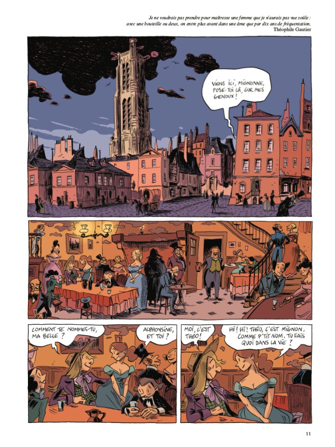 Face à l’homme historique et son héritage littéraire, on peut penser que le dessin sera presque accessoire. Daniel Casanave a choisi un trait original, qui peut choquer lorsque démarre le récit, puisque Nerval ou Gautier sont représentés dans un style fougueux, les corps sont tendus, proches de la caricature. Les personnages ont une fluidité qui favorise les expressions exagérées, mais qui se heurte à d’autres personnes comme Hugo ou Dumas qui ont eu droit à un travail plus poussé, à la fois sérieux et caricatural, qui là encore, surprend. Pour le reste, l’ambiance colorée qui fait passer des cafés parisiens aux souks de l’Orient, sans oublier les bulles de fantasmes ou les songes oniriques voire délirants, impriment un rythme complexe mais extatique, à l’image de l’œuvre de l’écrivain en vérité.